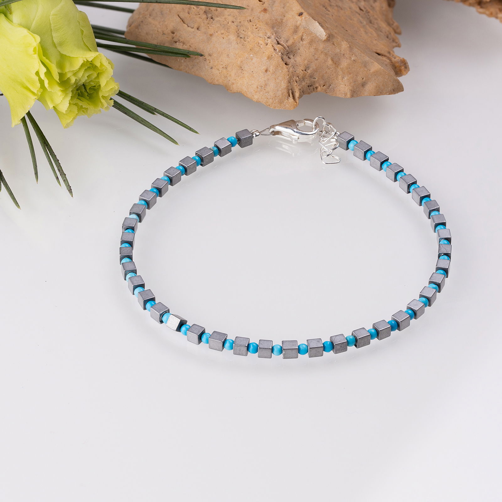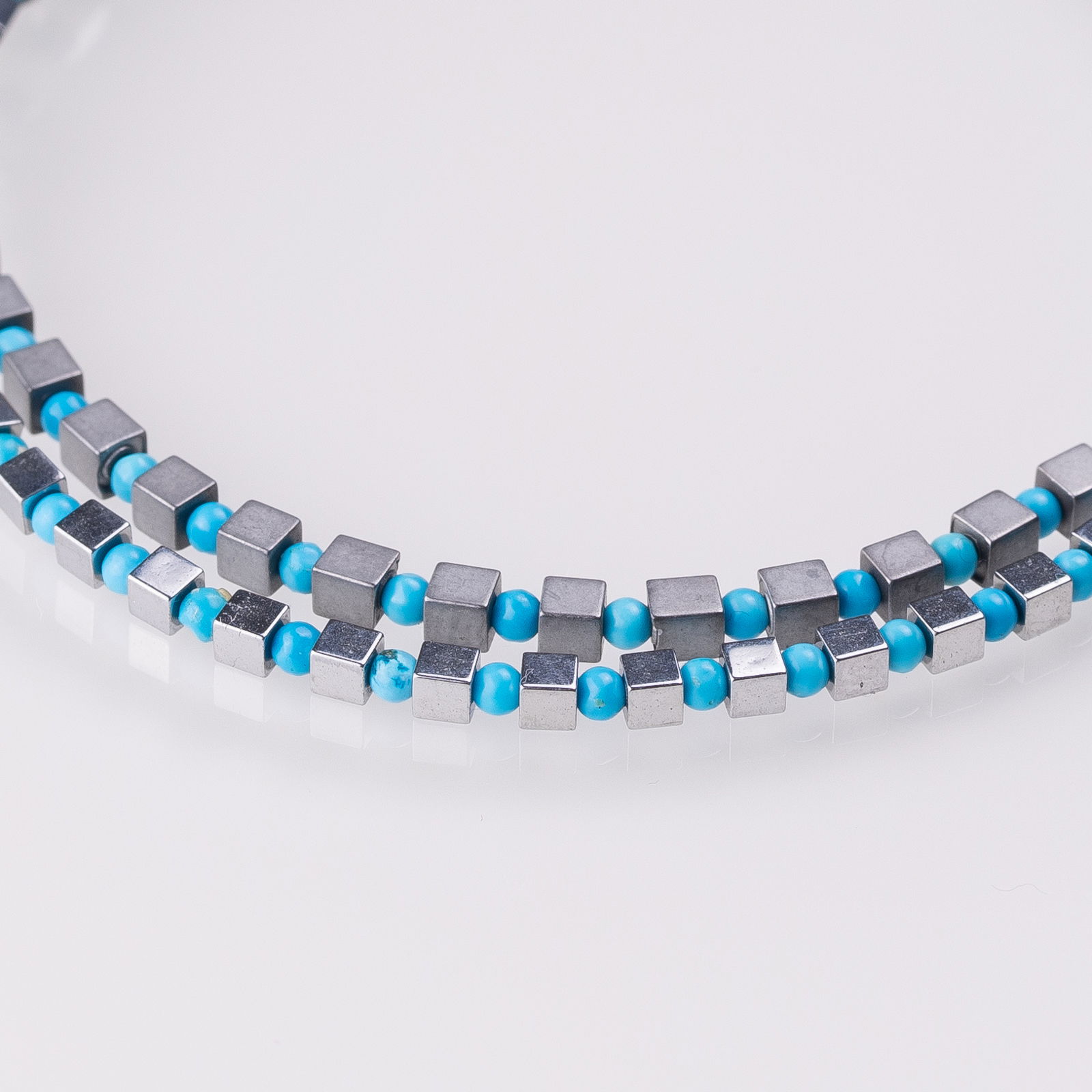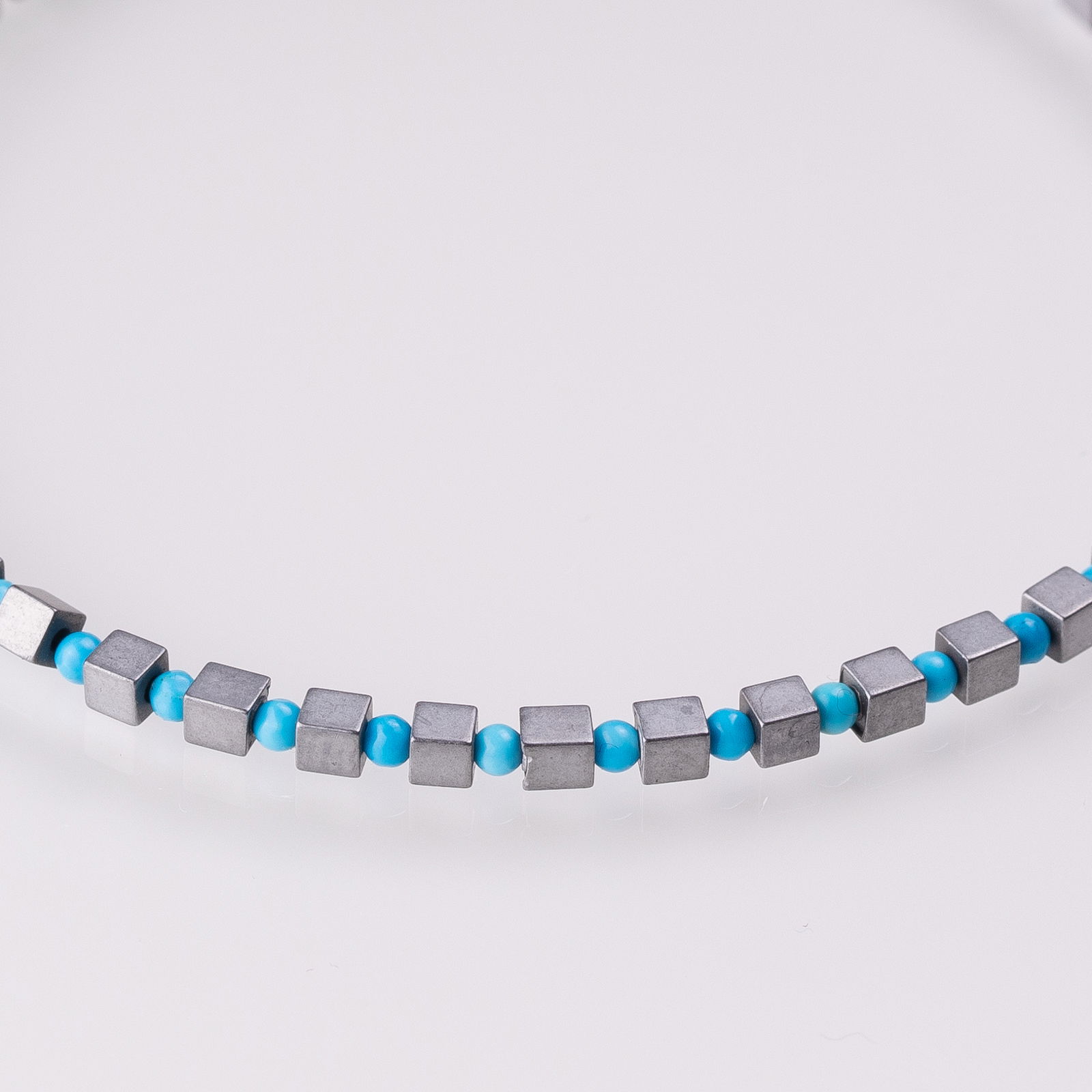 Maia Colt Bratara argint subtire din cuburi de hematit argintiu mat si turcoaz 1.5mm