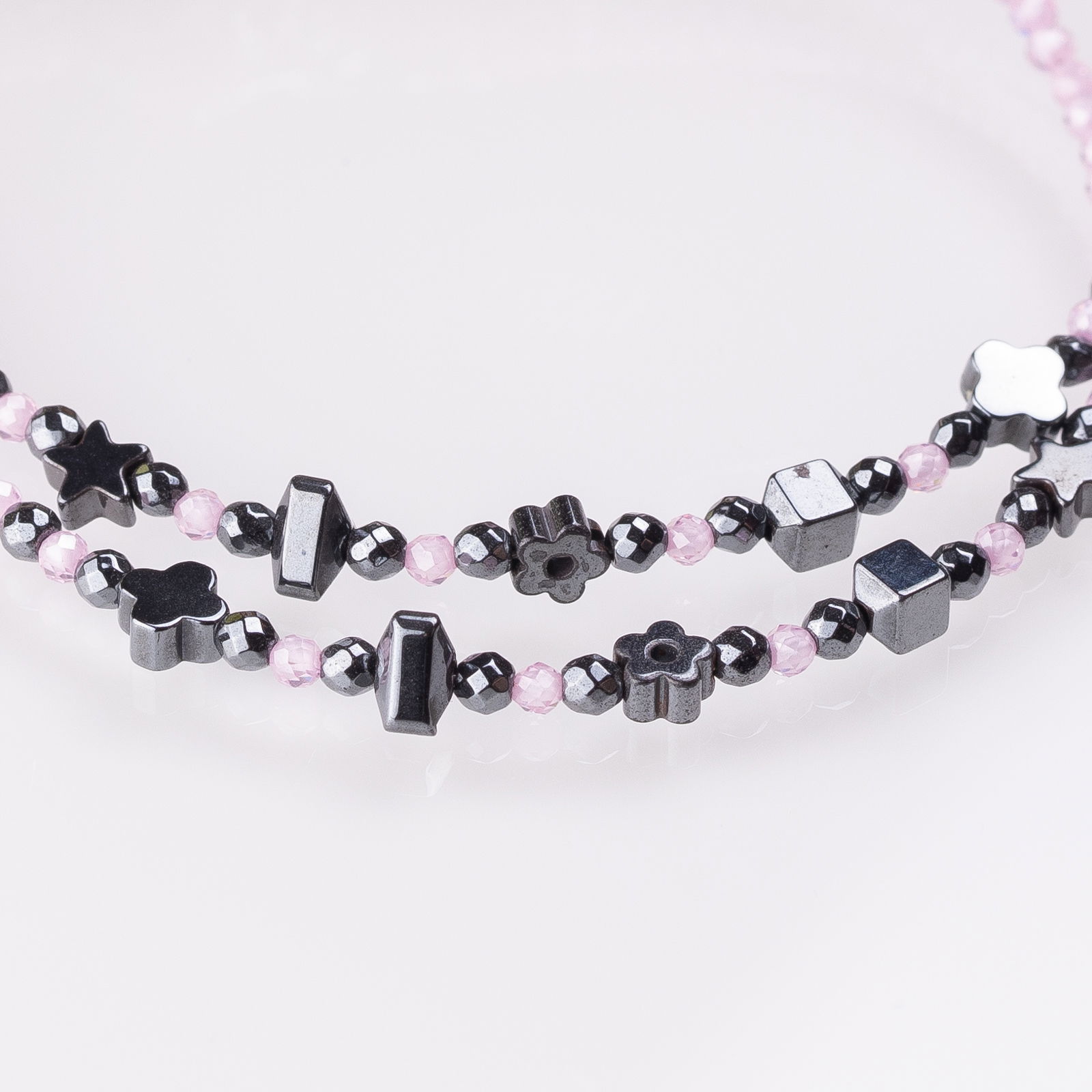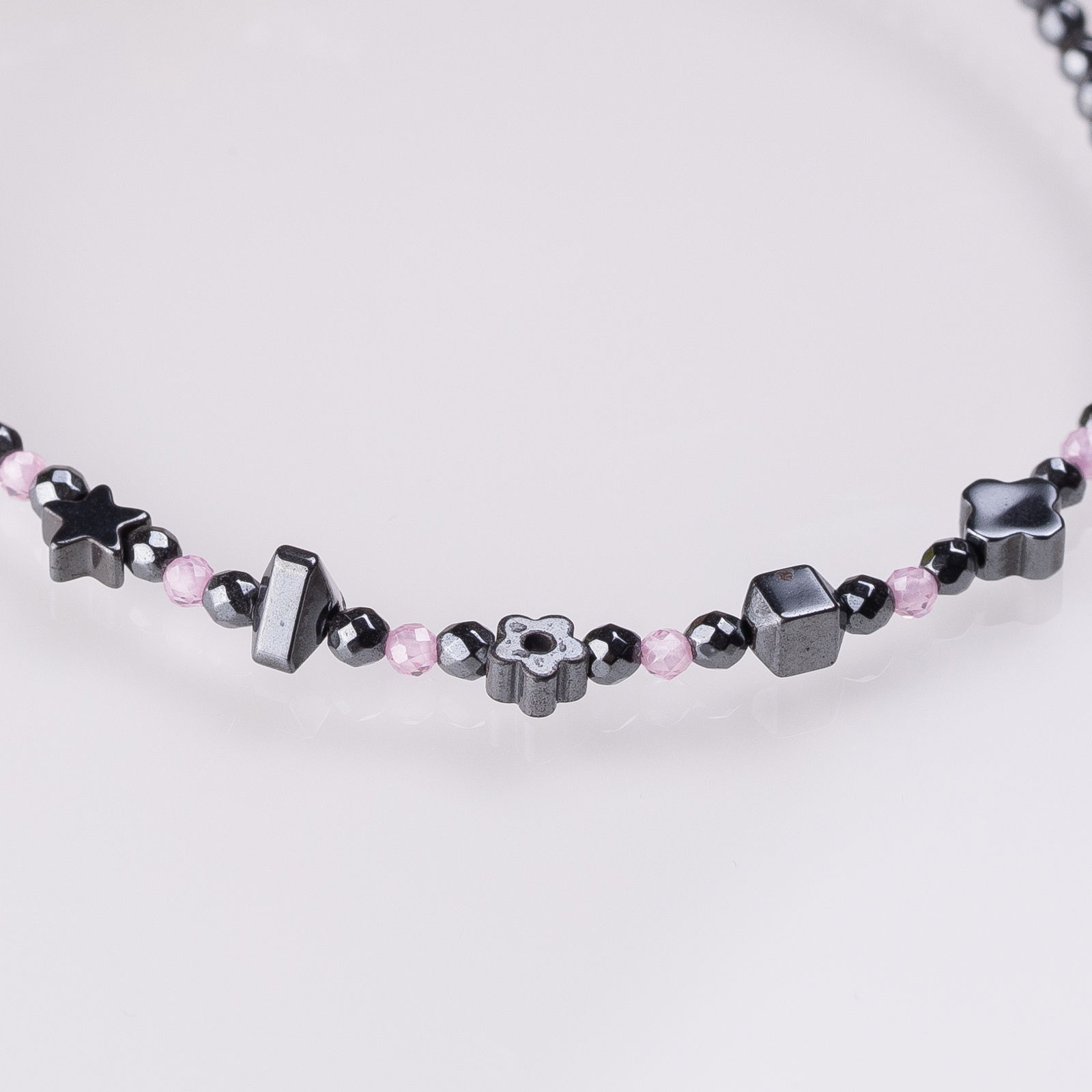 In partea din mijoc are pietre de hematit argintiu inchis de diferite forme si cubic zirconia roz deschis de 1.5 mm.