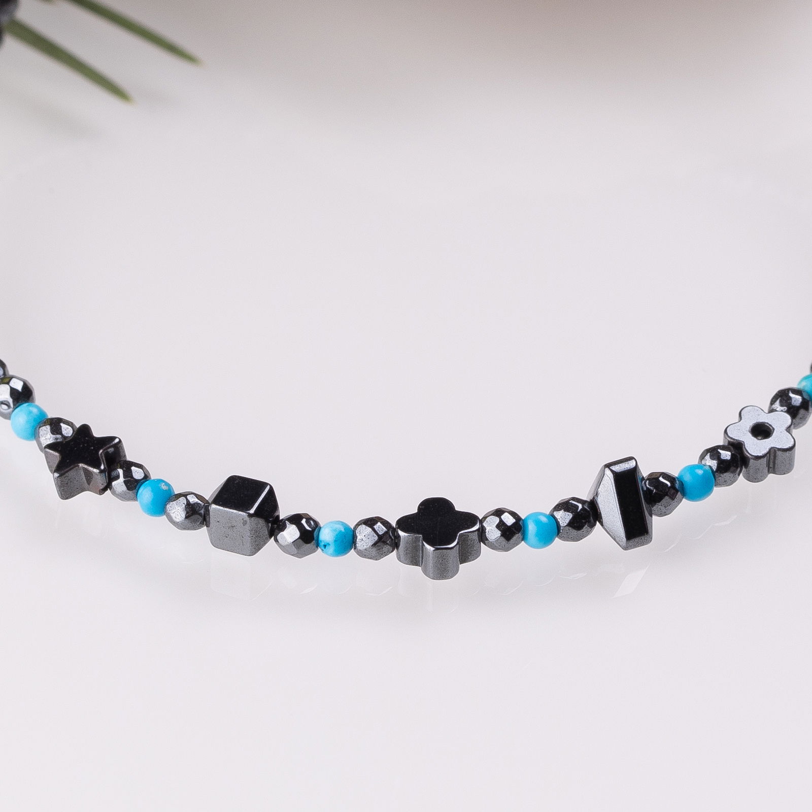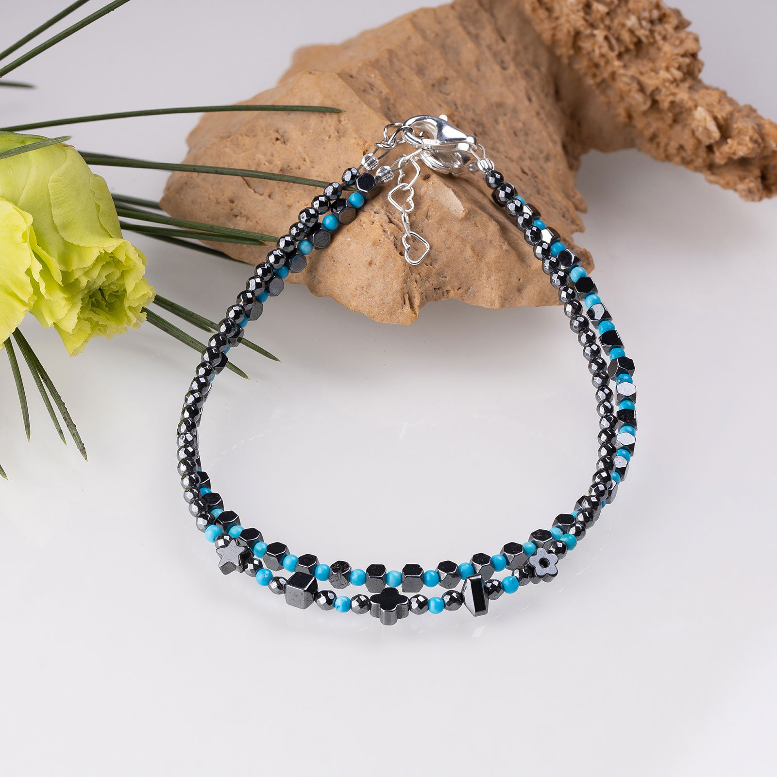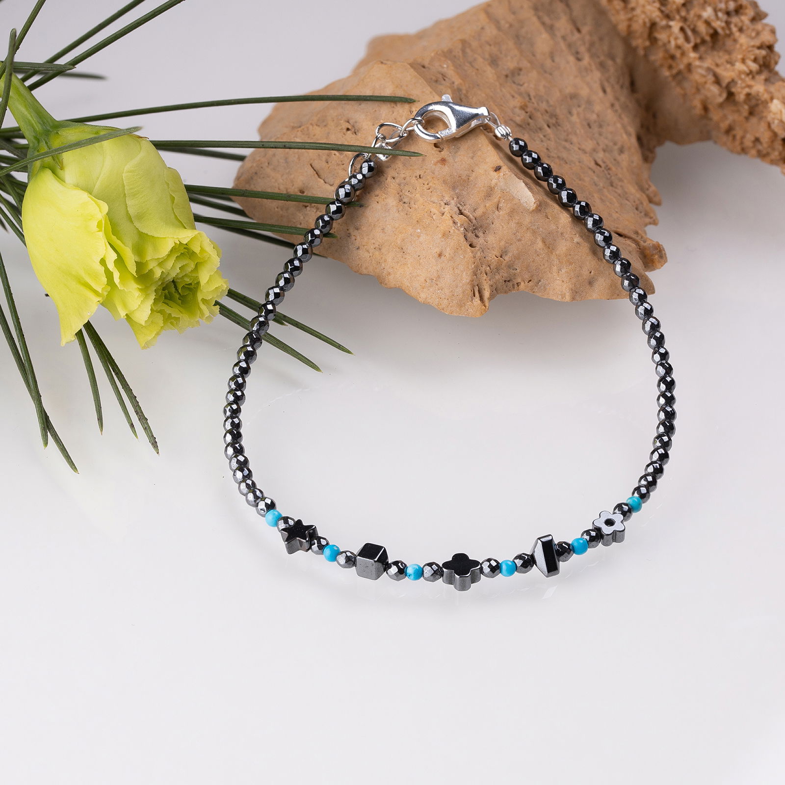 In partea din mijoc are pietre de hematit argintiu inchis de diferite forme si pietricele rotunde de turcoaz de 1.5 mm.