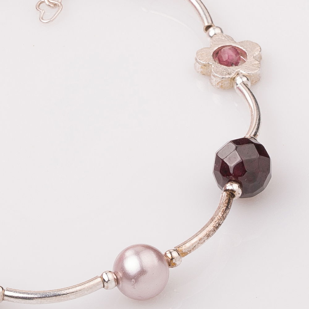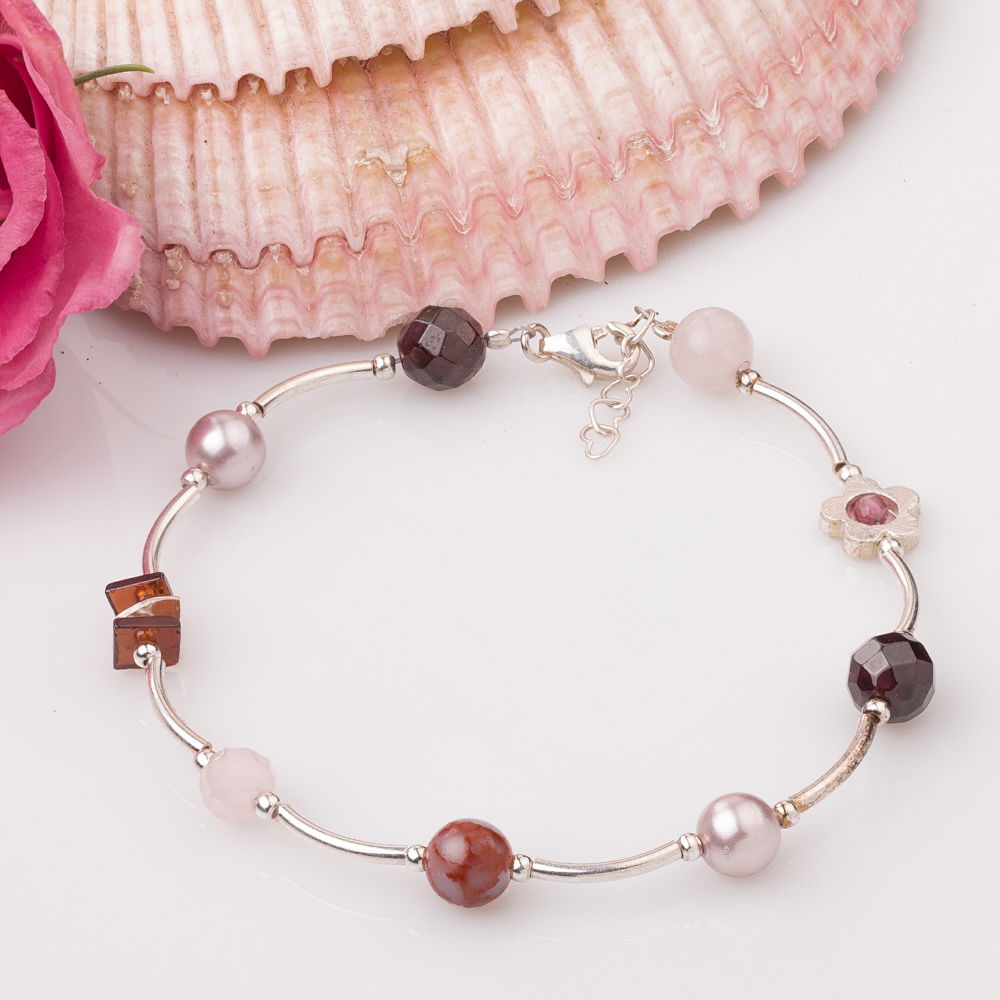 Bratara handmade cu tuburi curbe din argint, kiwi howlit (6 mm), granate fatetate si plate (6 mm), cuart roz fatetat (6 mm) si perle sintetice (6 mm).