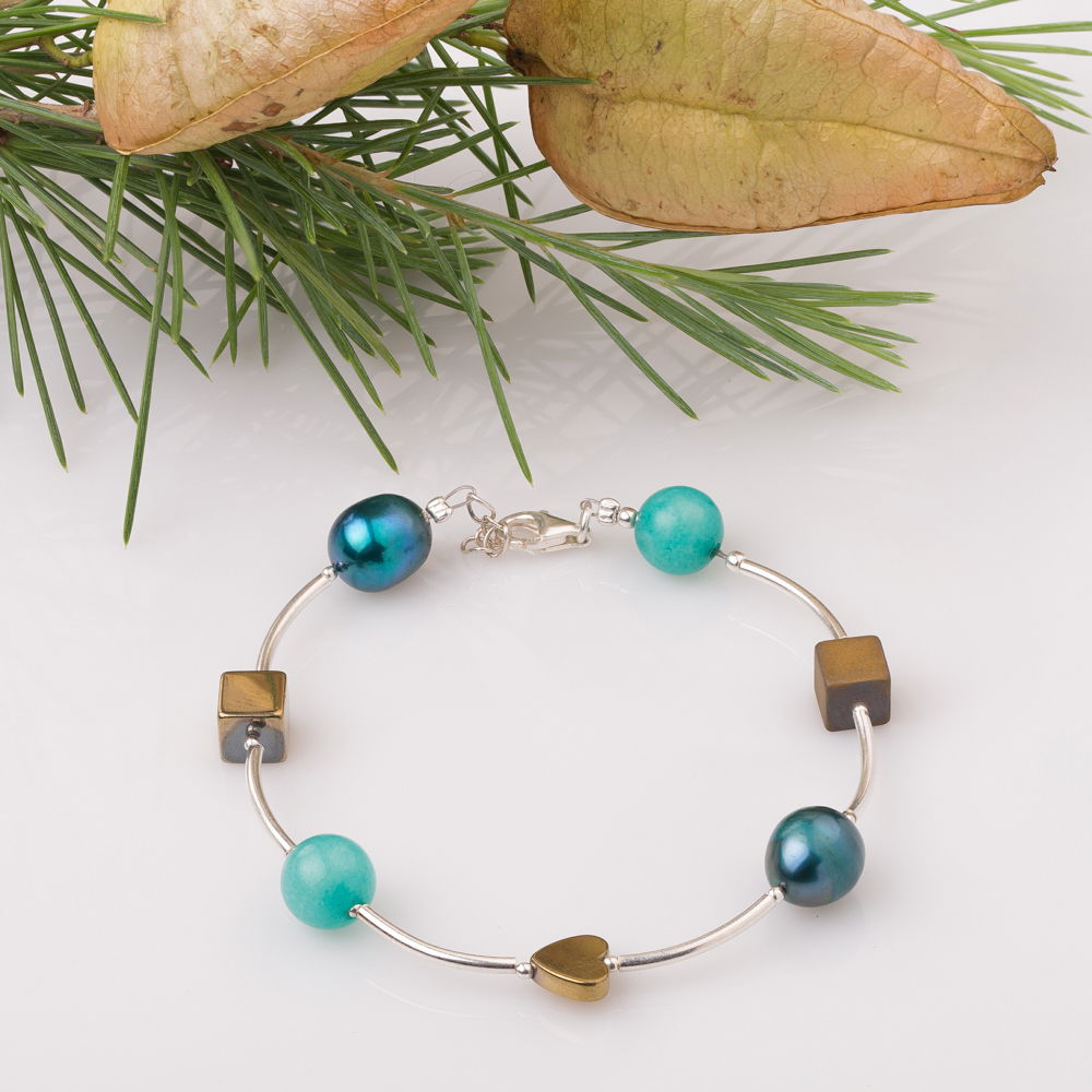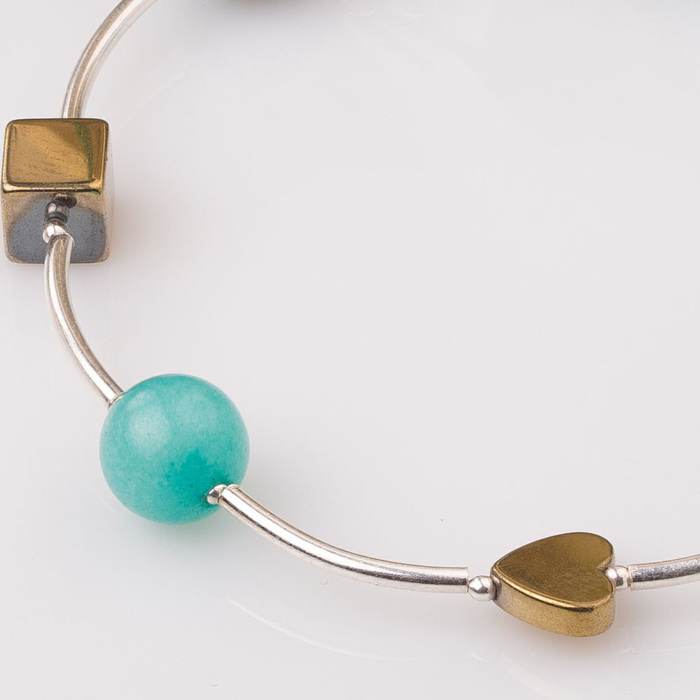 Bratara handmade cu tuburi curbe din argint, amazonit (8 mm), perle (8mm) si cuburi de hematit auriu mat si lucios (8mm).