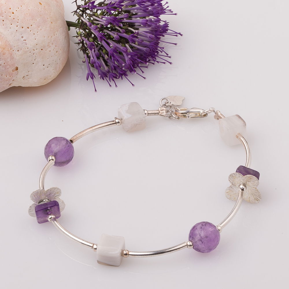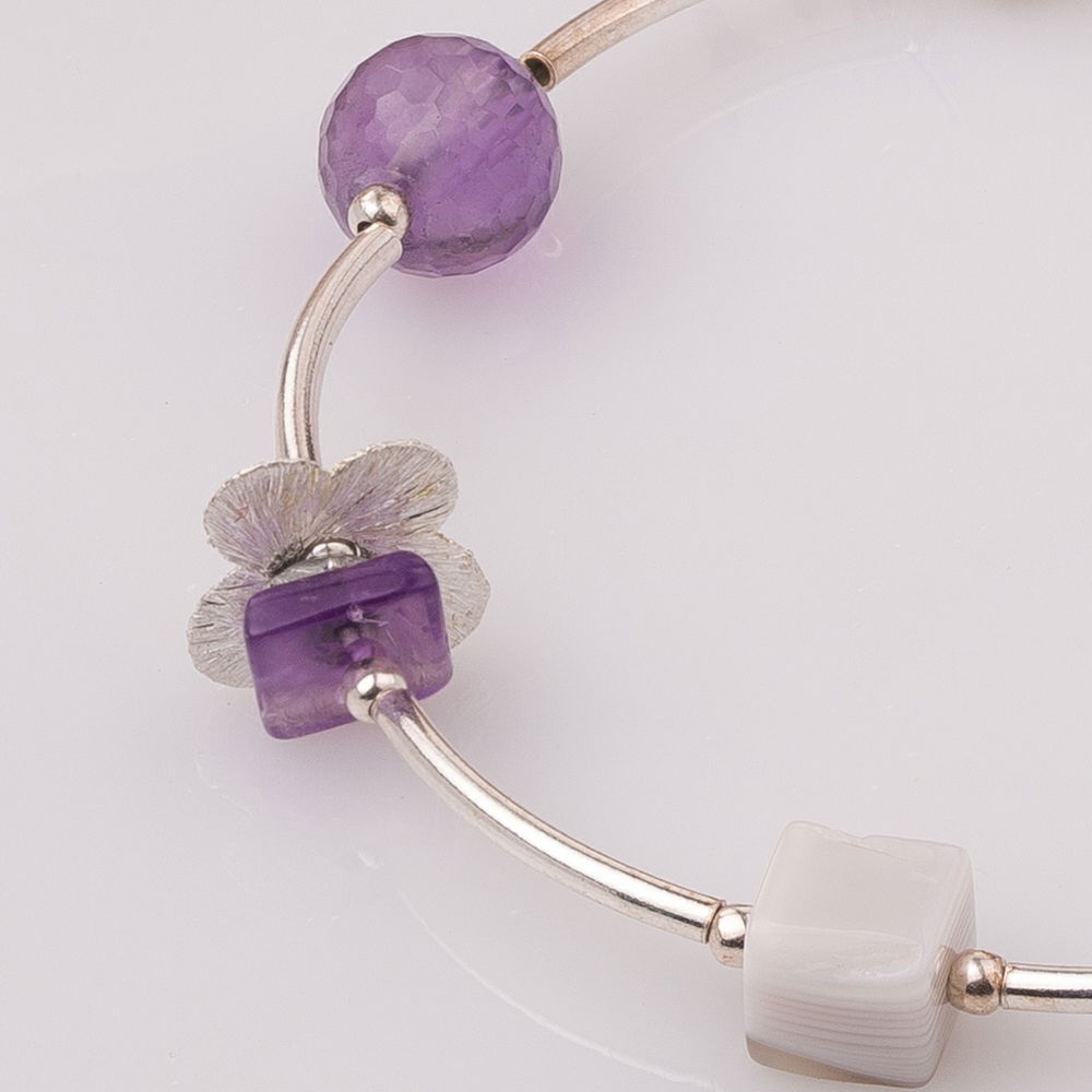 Bratara handmade cu tuburi curbe din argint, pietre de ametist fatetat (8 mm) si cuburi de agate de Botswana (6mm).