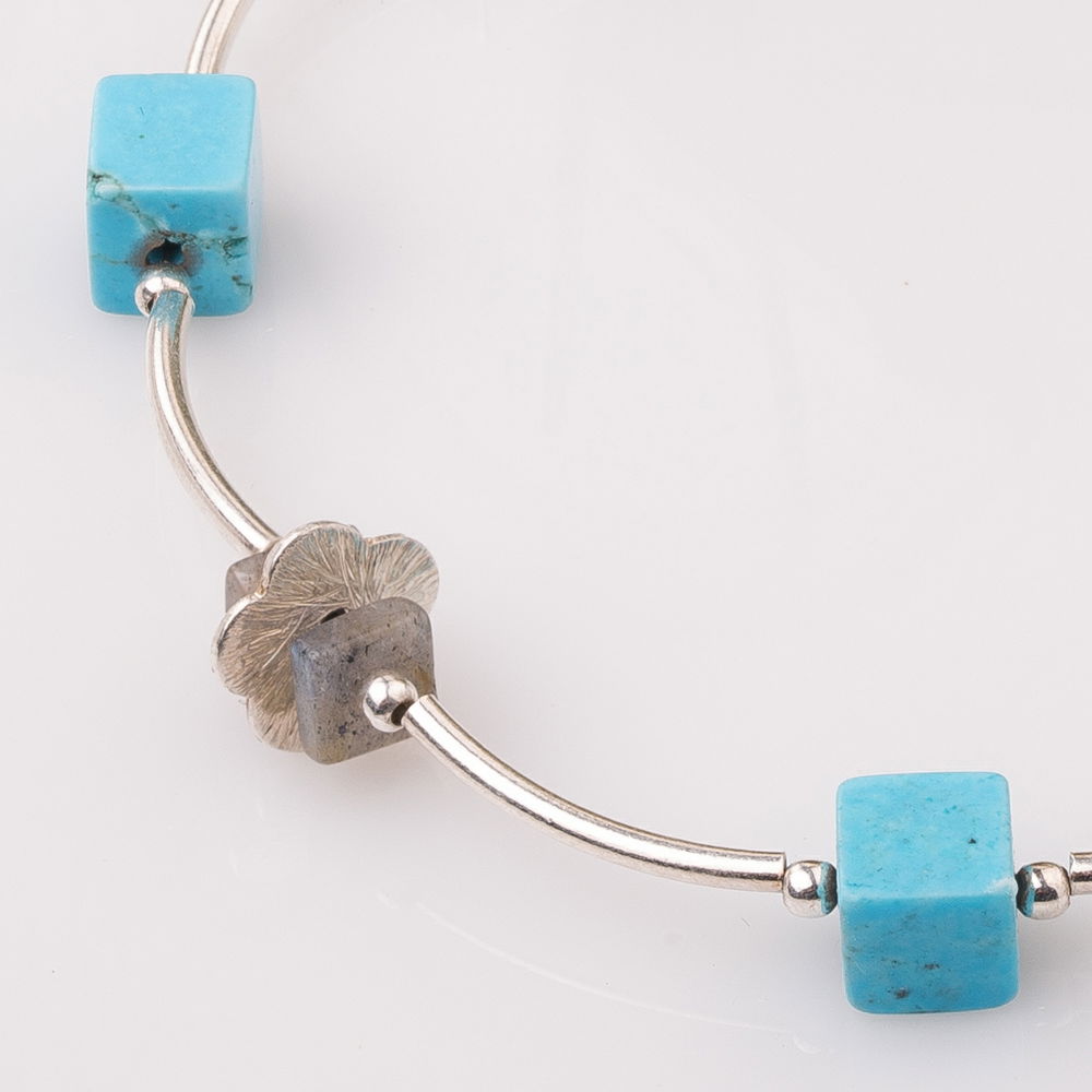 Bratara handmade cu tuburi curbe din argint, cuburi de turcoaz (6 mm) si cuburi de hematit argintiu mat si lucios (6 mm).