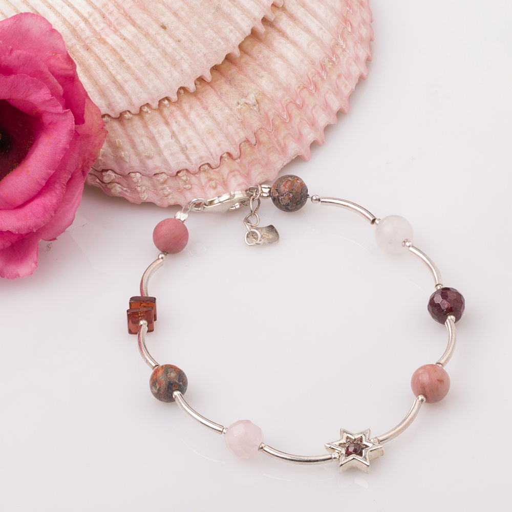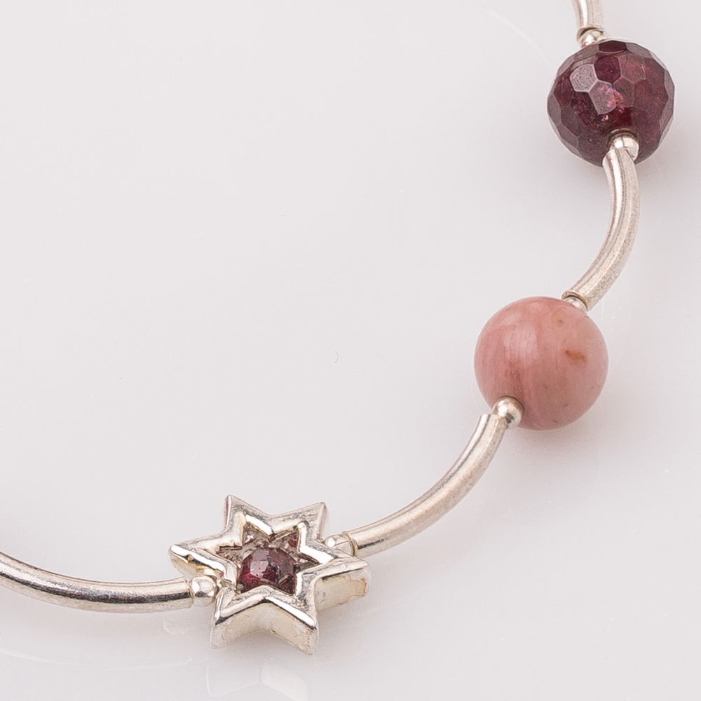 • Bratara handmade cu tuburi curbe din argint,  leopardit (6 mm), rodonit (6 mm), cuart roz fatetat (6 mm), granate fatetate (6 mm) si placute de granat.