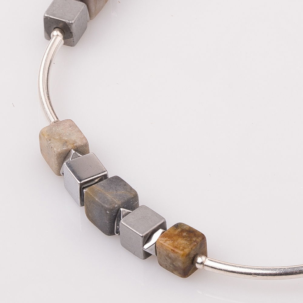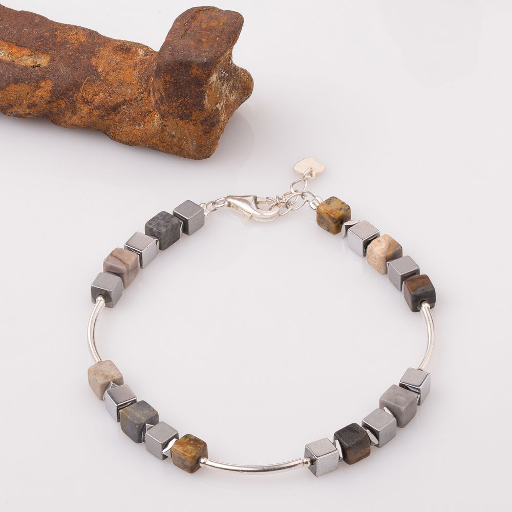 Bratara handmade cu tuburi curbe din argint, cuburi de jasp mat si lucios (4 mm) si cuburi de hematit argintiu mat si lucios (4mm). Incuietoare si lant prelungitor din argint cu terminatie in forma de inimioara.