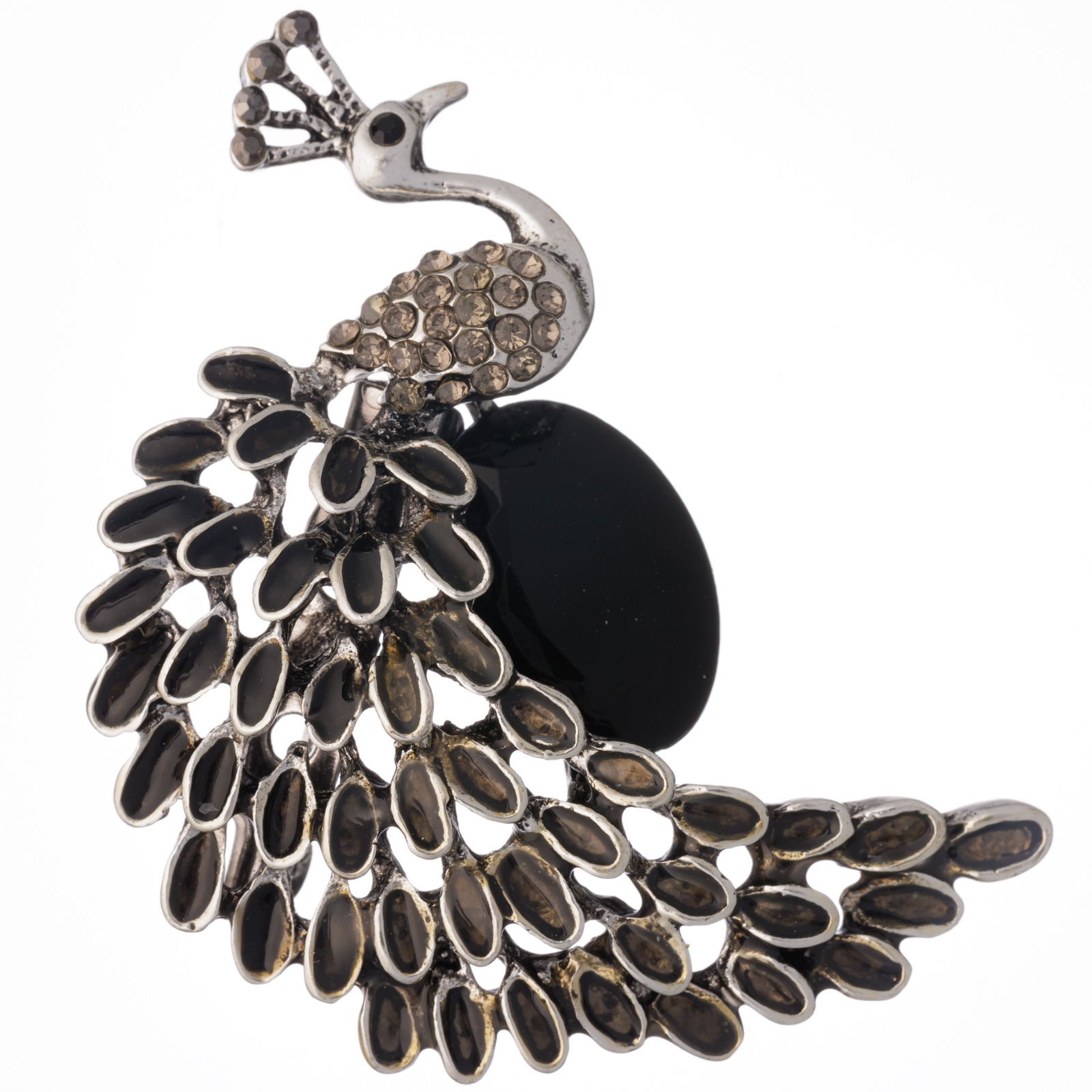 Shopika Brosa metalica argintie cu pietricele mici, paun cu coada mare si pietre negre, simbol al intelepciunii
