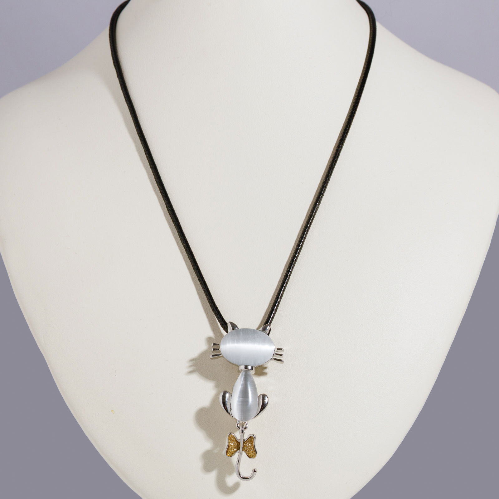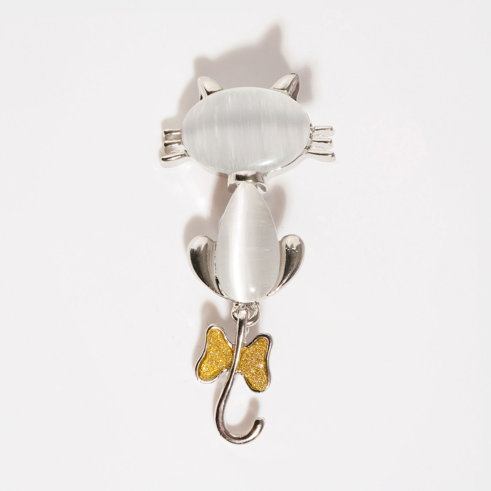 Shopika Brosa pandant metalica argintie cu sidef, pisica cu fundita la coada mobila