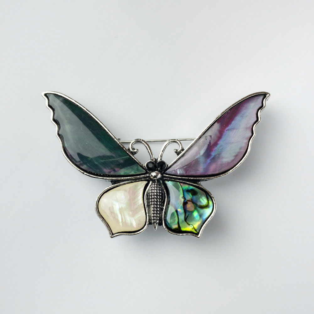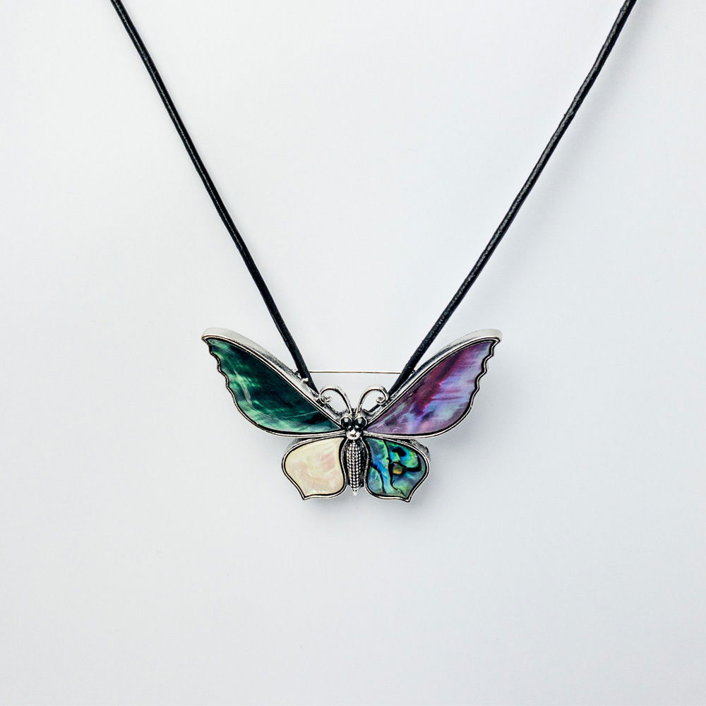 Shopika Brosa pandant metalica argintie, fluture cu aripi din paua shell naturala si sidef
