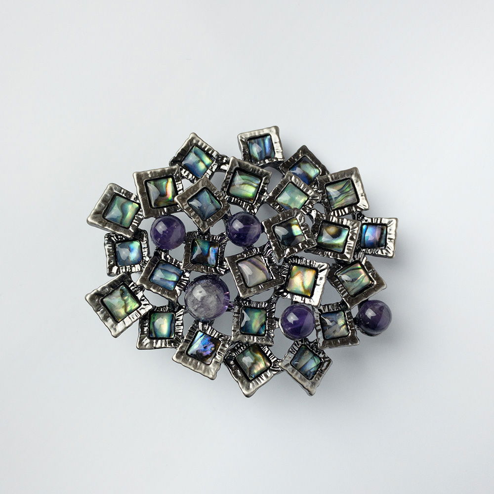 Shopika Brosa pandant metalica argintie, model geometric cu paua shell si ametist naturale
