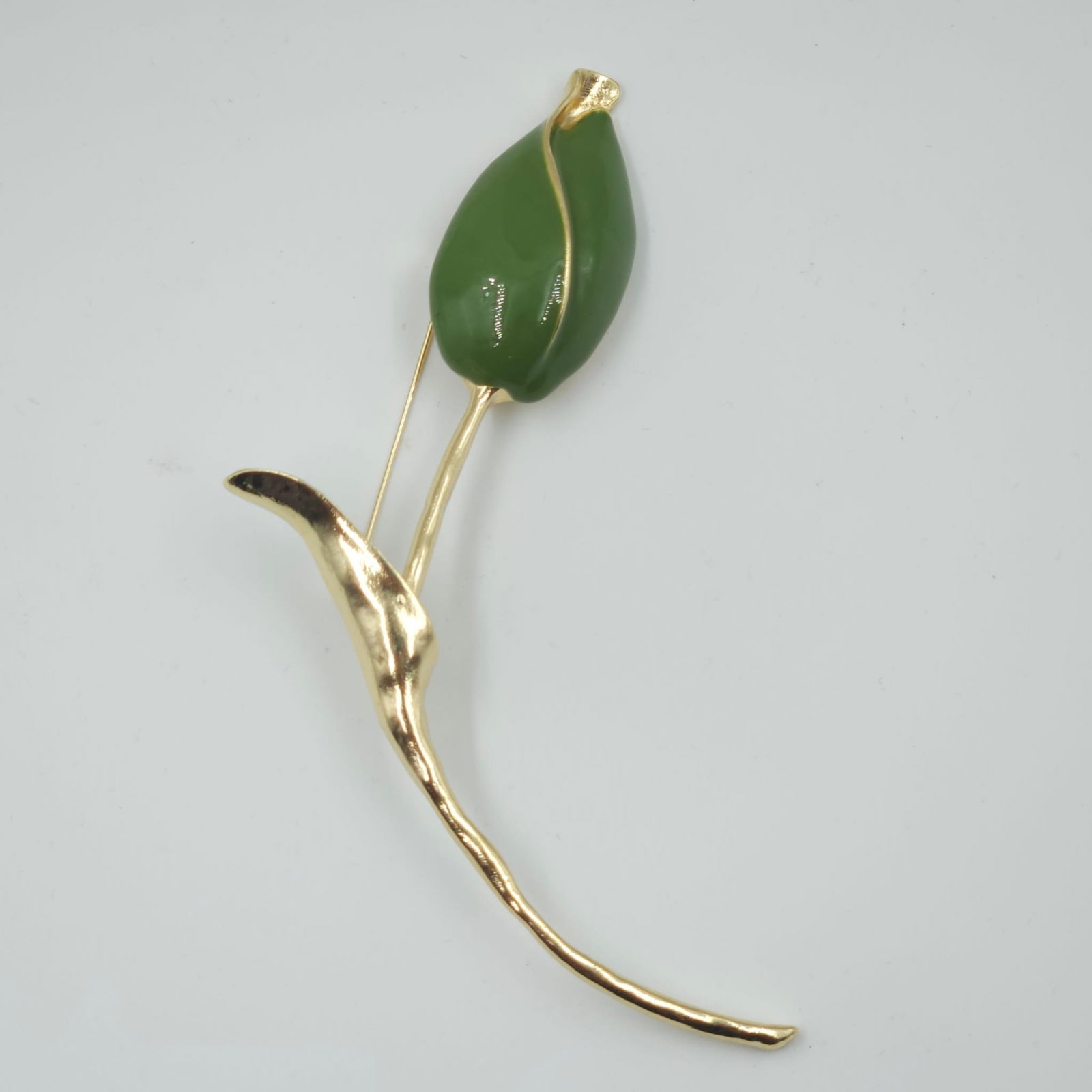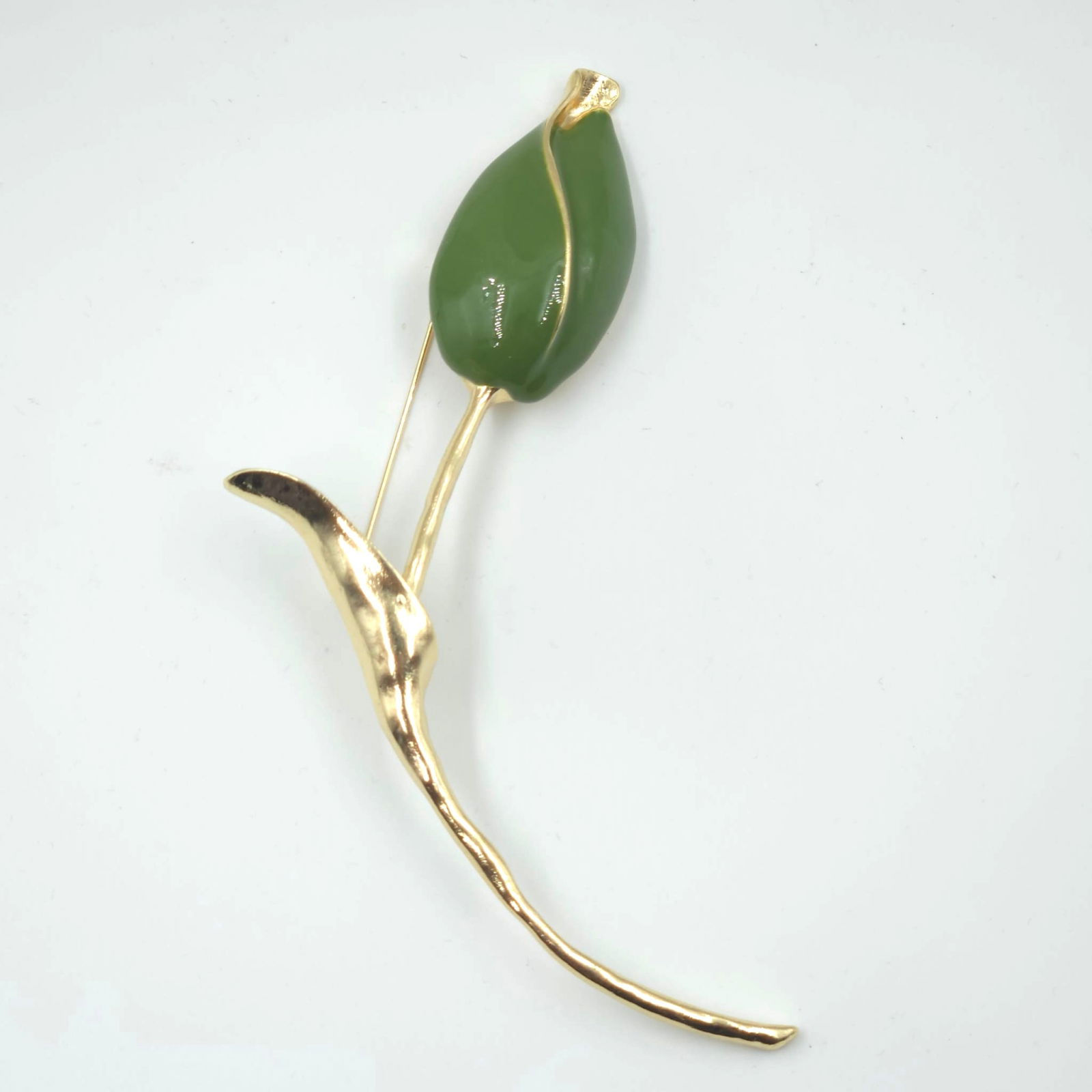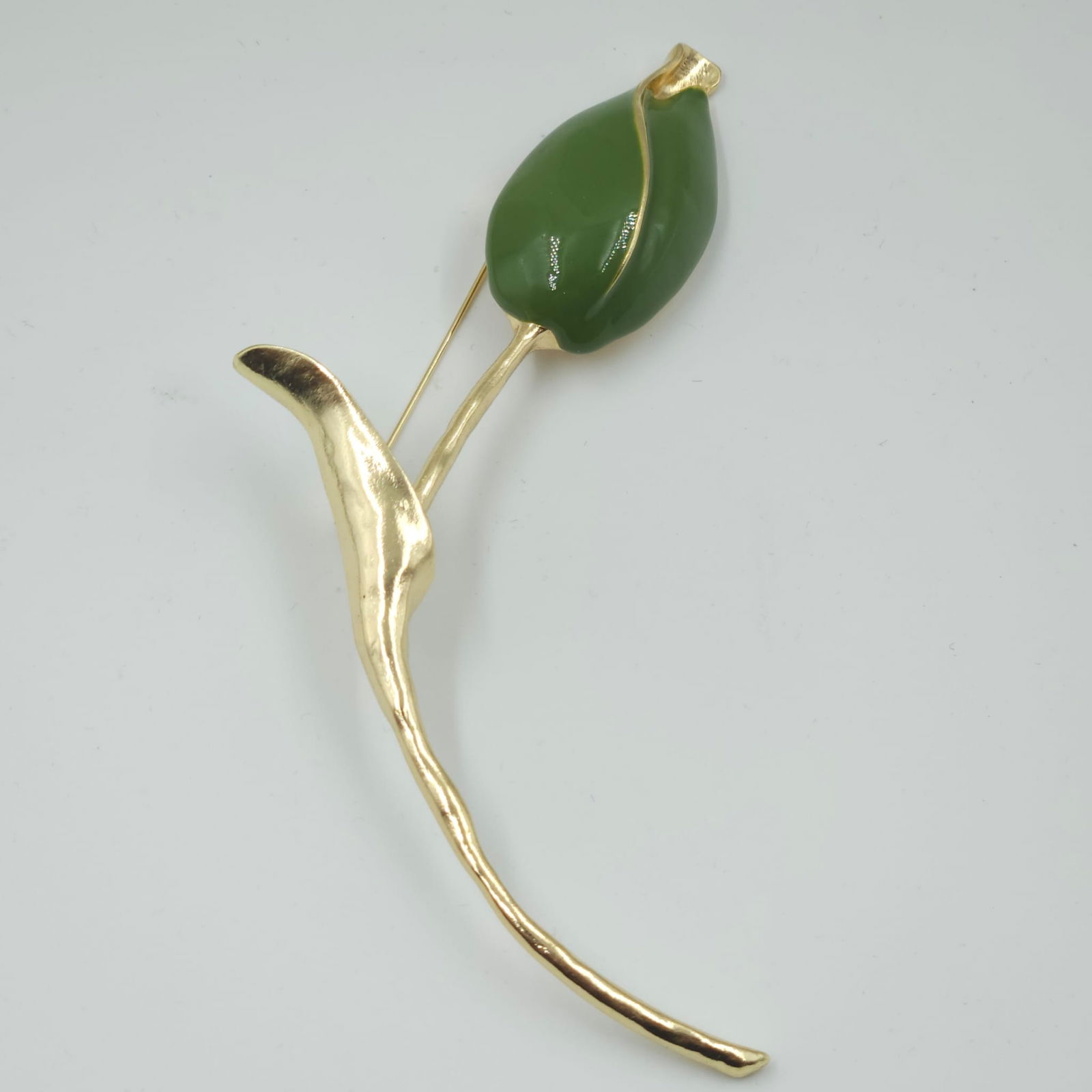 Shopika Brosa statement lalea imbobocita, forma stilizata din metal auriu cu verde