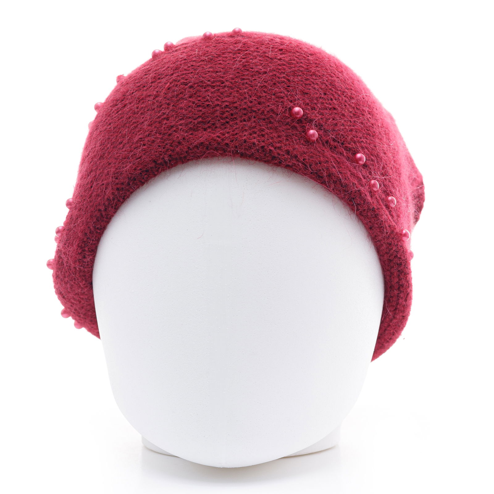 Caciula bordo model tricotat cu perle fine aplicate, dublata in interior