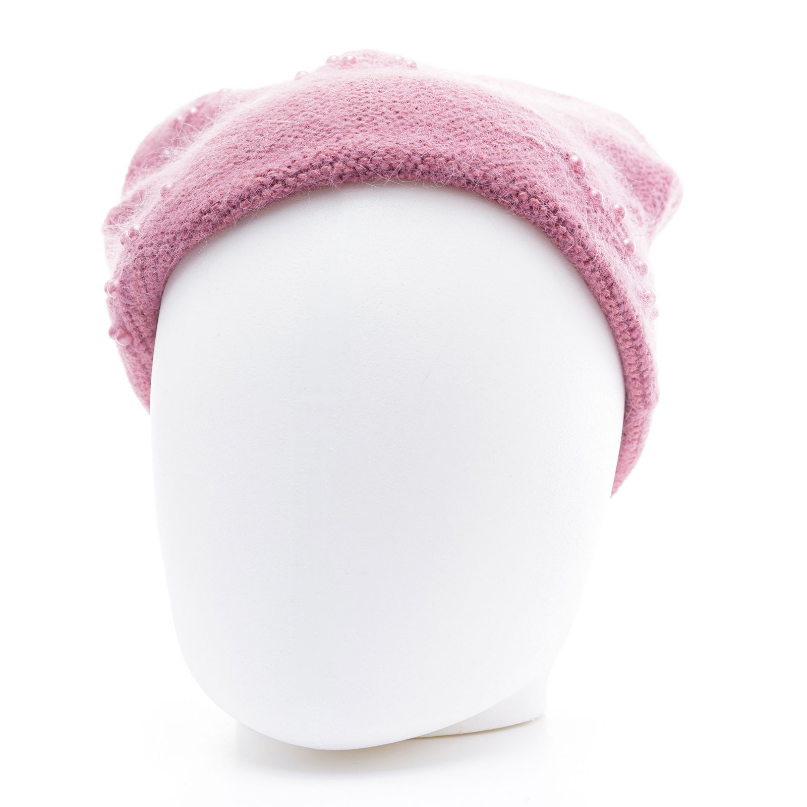 Caciula roz model tricotat cu perle fine aplicate, dublata in interior