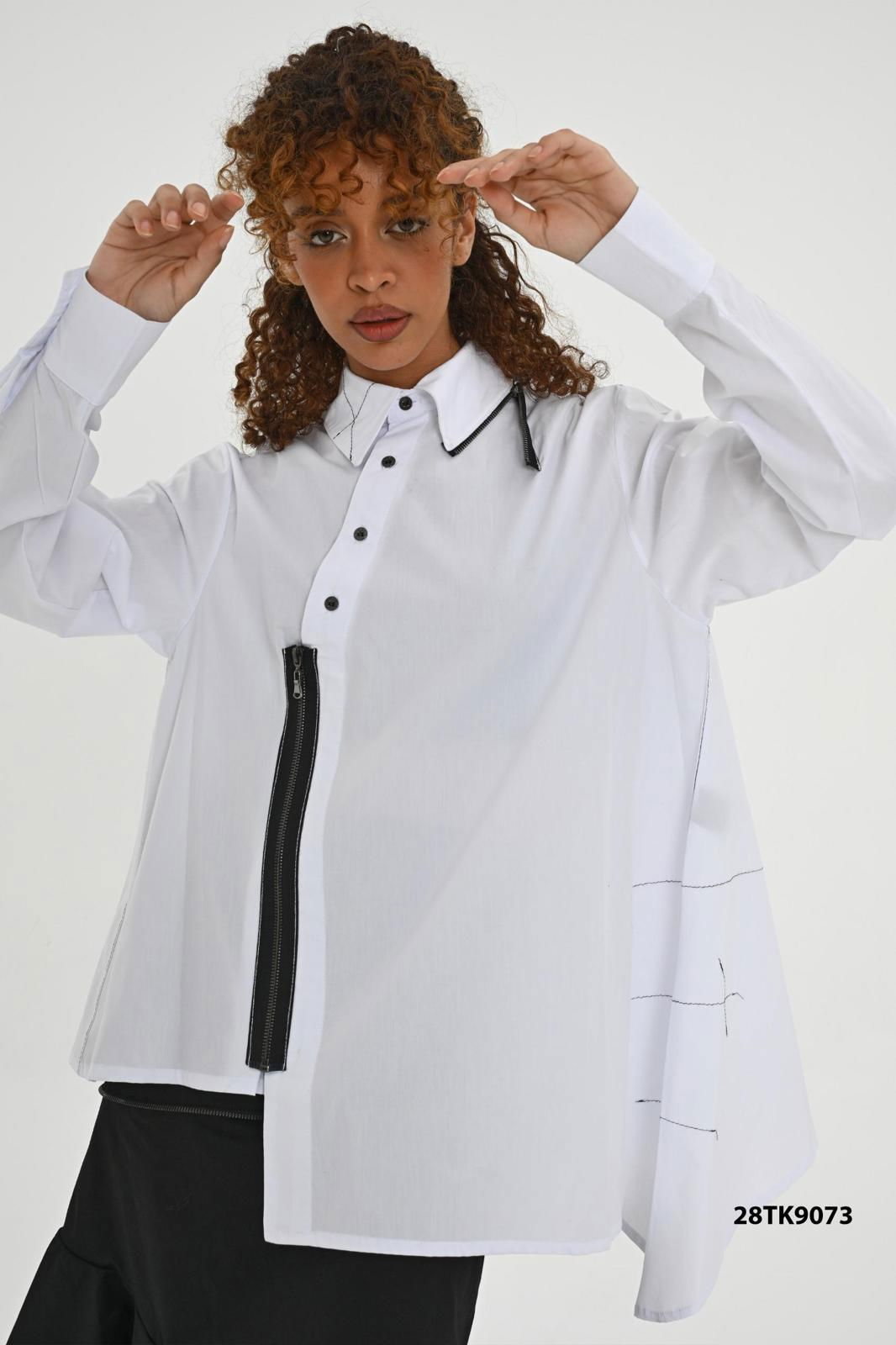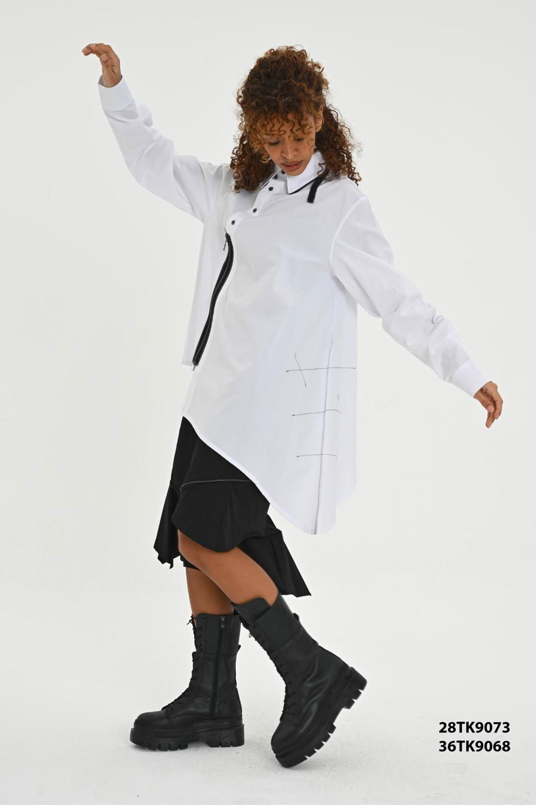 LES MIOS Camasa alba evazata cu colt lateral si fermoare negre, cu cusaturi negre
