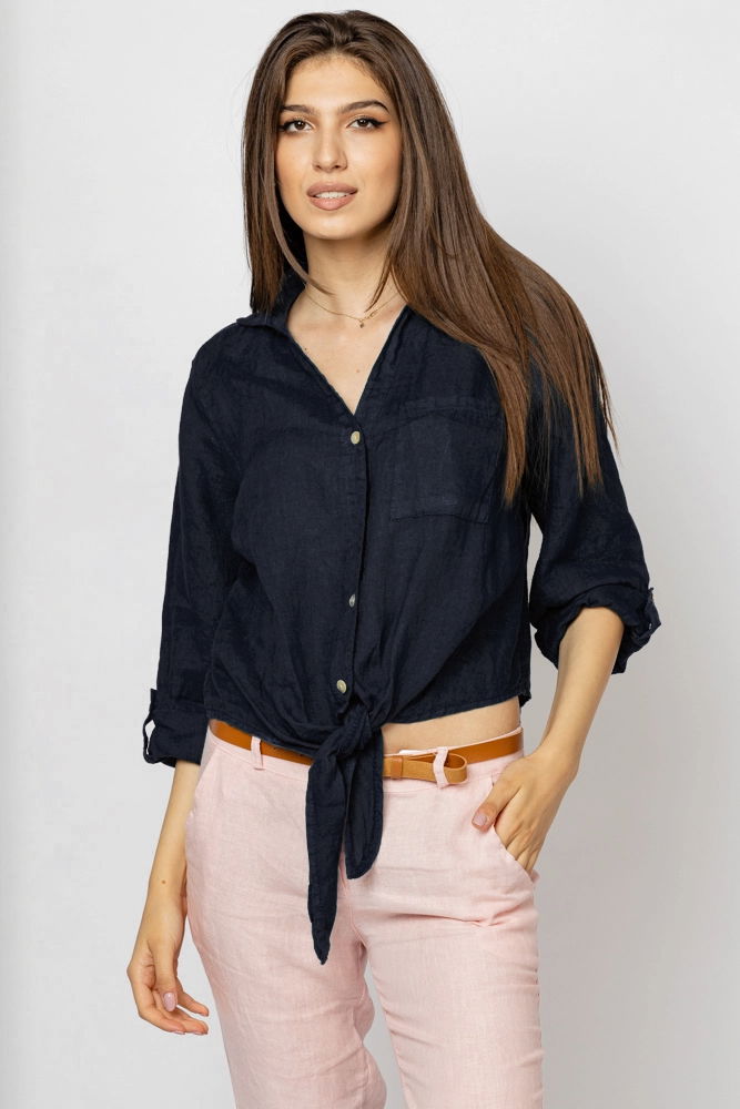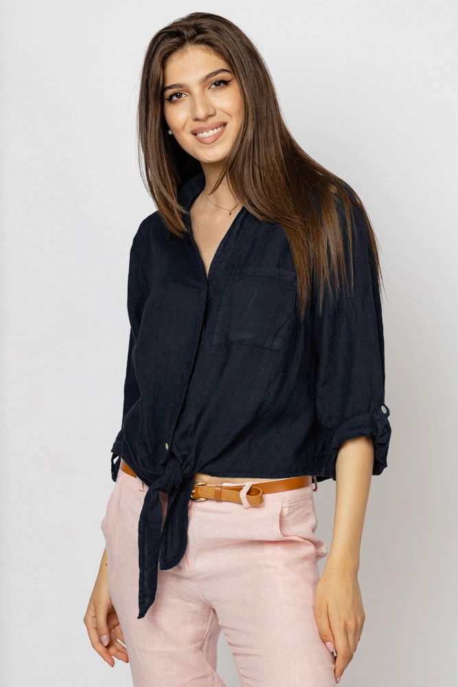 Camasa din in ce se prinde cu un nod in fata este lejera si comoda ce poate fi asortata usor in tinute casual.