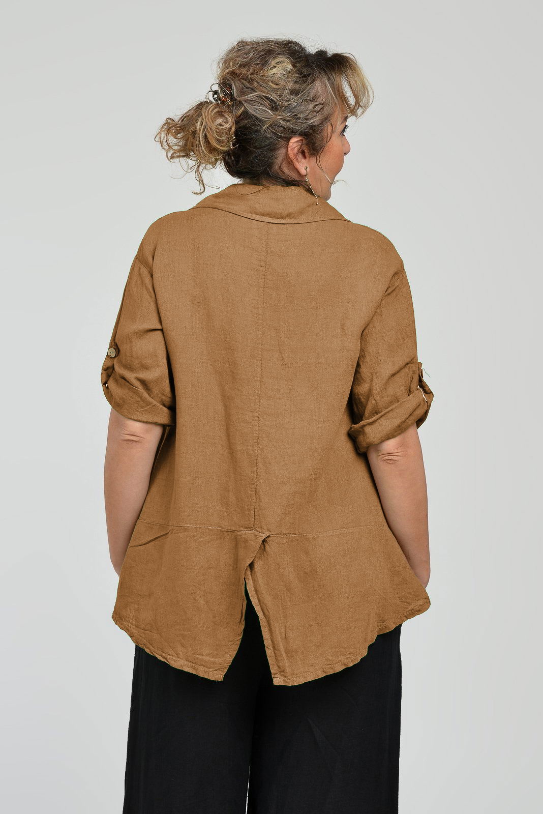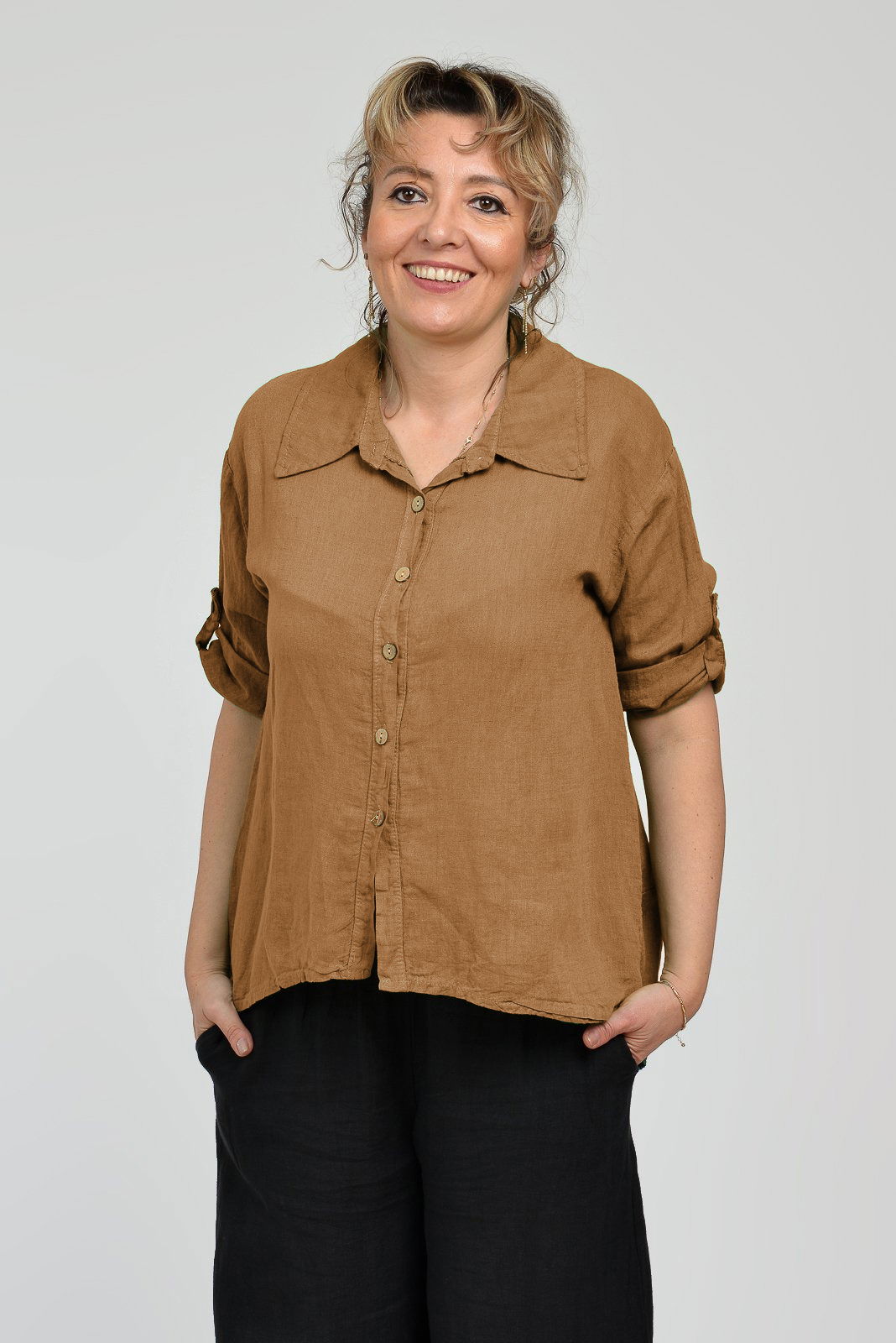 Cămașa din in combină eleganța clasică cu un design modern și jucăuș. Cu un croi mai scurt în față și o coadă de rândunică delicată în spate, acest model adaugă un aer rafinat și fluid ținutelor tale. Materialul ușor și respirabil al cămășii din in o face perfectă pentru zilele calde de vară, în timp ce detaliile de design pun în valoare silueta, oferind un aspect chic și în același timp confortabil. Se poate purta cu pantaloni lejeri sau fuste, fiind ideală pentru un look casual dar și pentru un stil boho mai sofisticat.