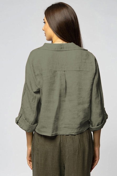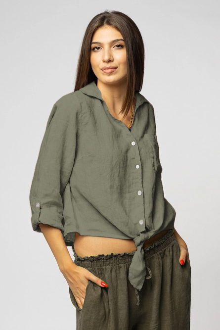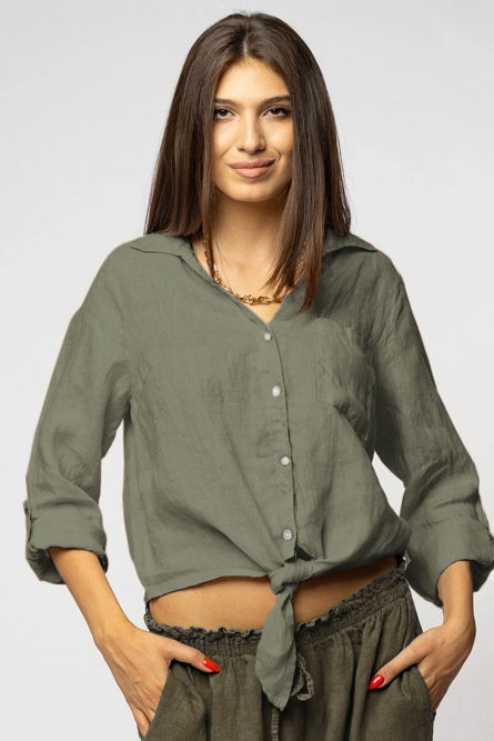 Camasa din in ce se prinde cu un nod in fata este lejera si comoda ce poate fi asortata usor in tinute casual.