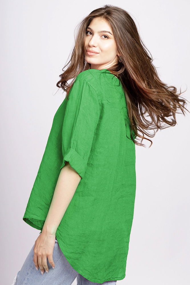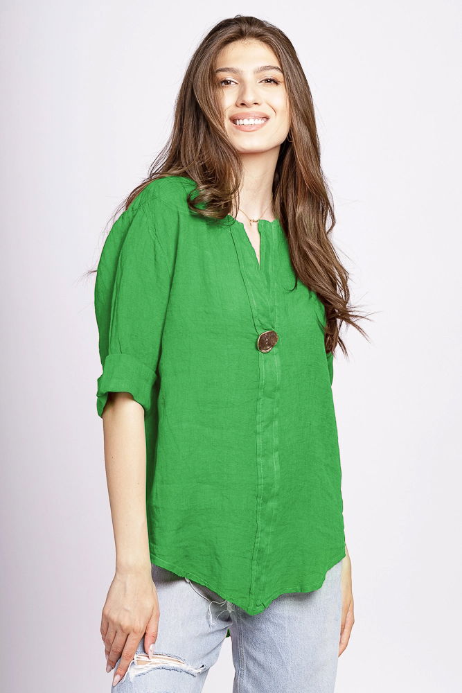 Shopika Camasa verde prazuliu din in cu nasture metalic decorativ