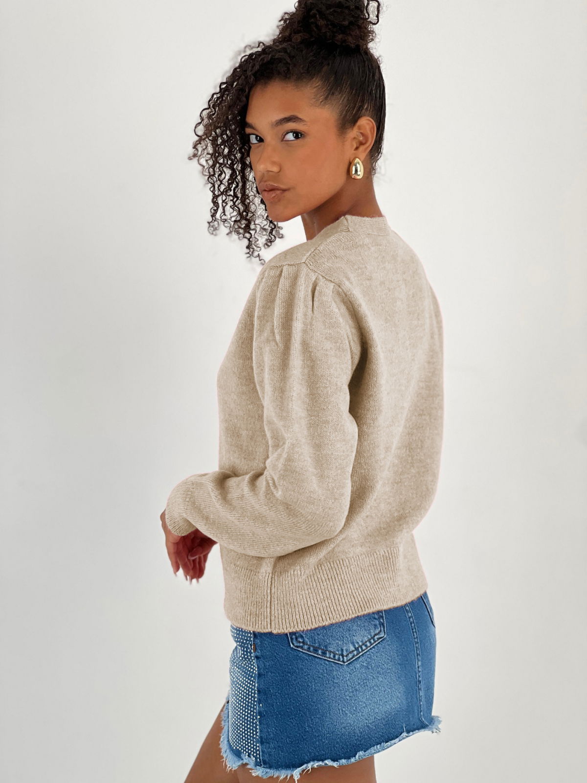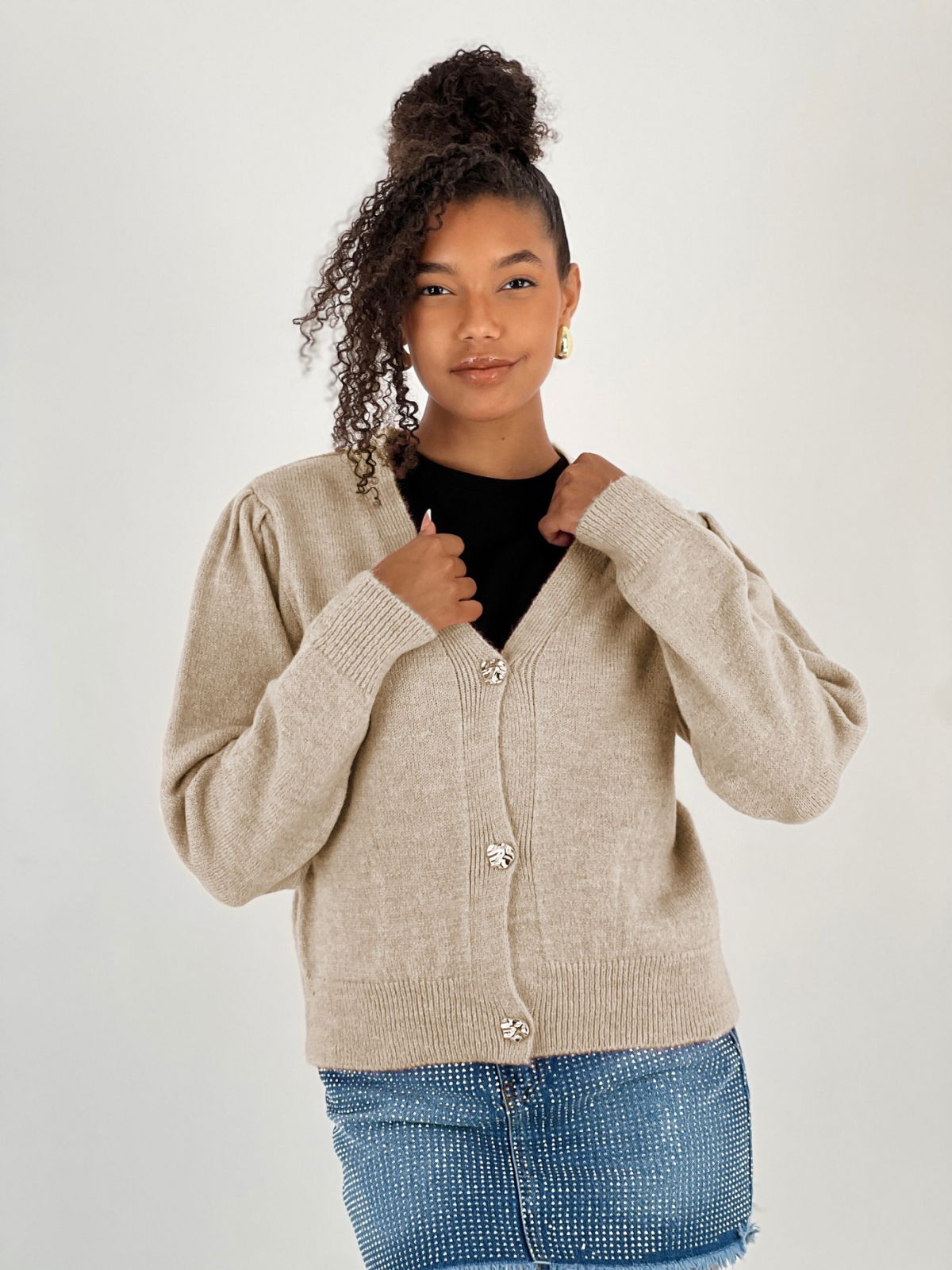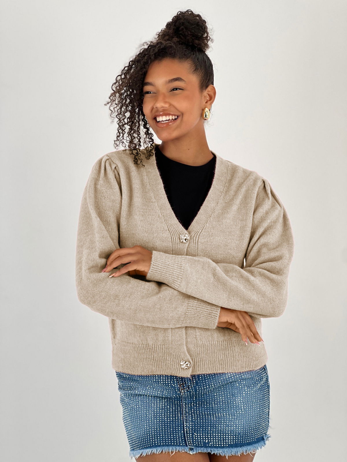 Miss Poem Cardigan cu decolteu in V, din tricotaj bej cu nasturi decorativi aurii