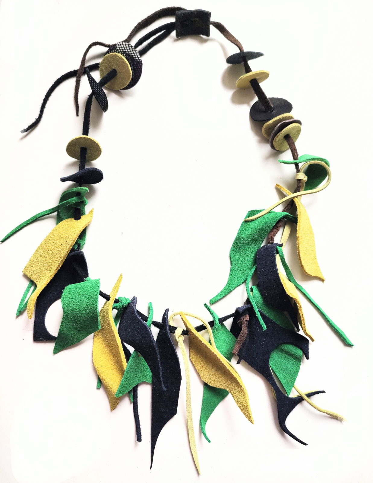 Un colier inedit realizat manual din mix de piele naturală,  care reprezintă o  declarație de  bună dispoziție și stil. Formele fluide, franjurile suprapuse și combinația de culori creează un accesoriu artistic și nonconformist.