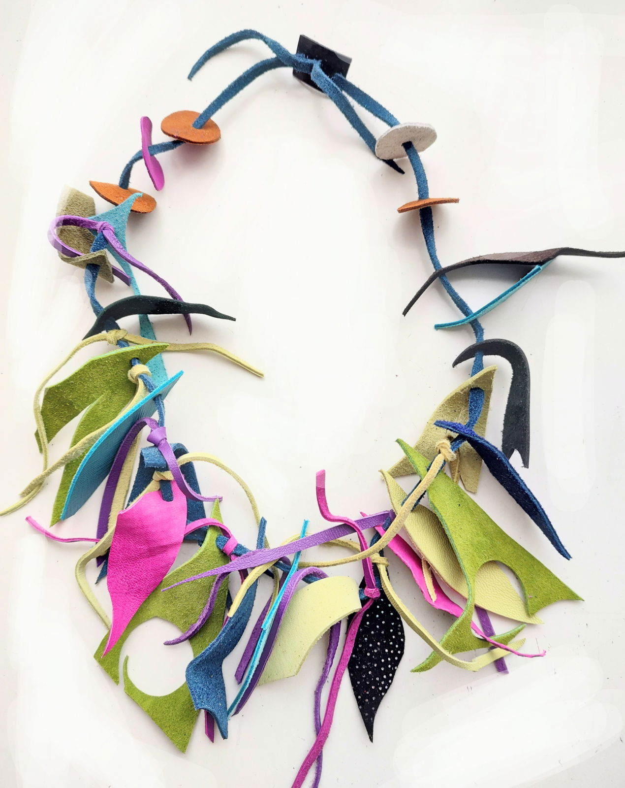 Un colier inedit realizat manual din mix de piele naturală,  ce reprezintă o  declarație de bună dispoziție și  stil. Formele fluide, franjurile suprapuse și combinația de culori creează un accesoriu artistic și nonconformist.