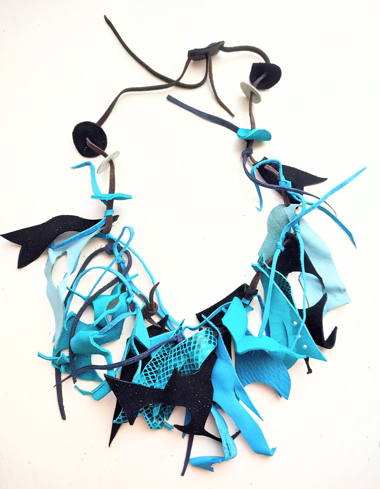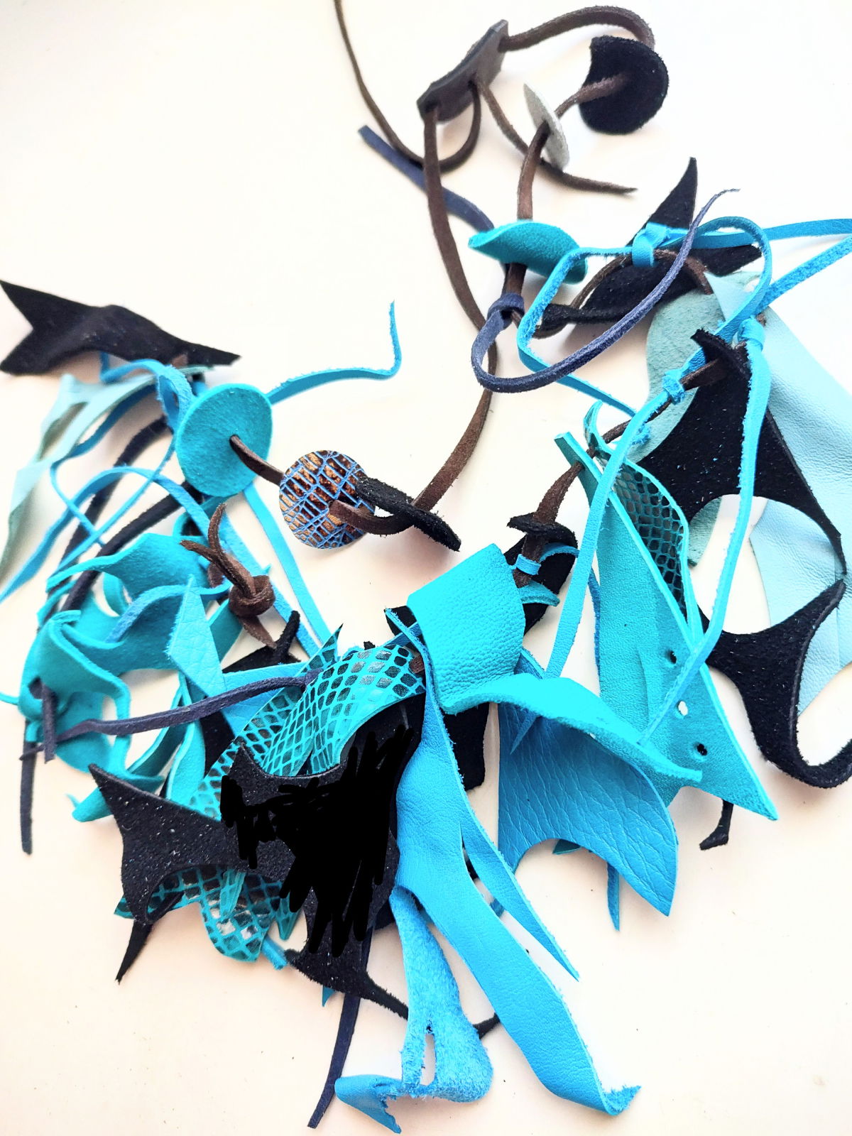 Un colier vesel ,inedit realizat manual din mix de piele naturală,  o explozie de culoare și o  declarație de  stil. Formele fluide, franjurile suprapuse și combinația îndrăzneață de culori creează un accesoriu artistic și nonconformist.