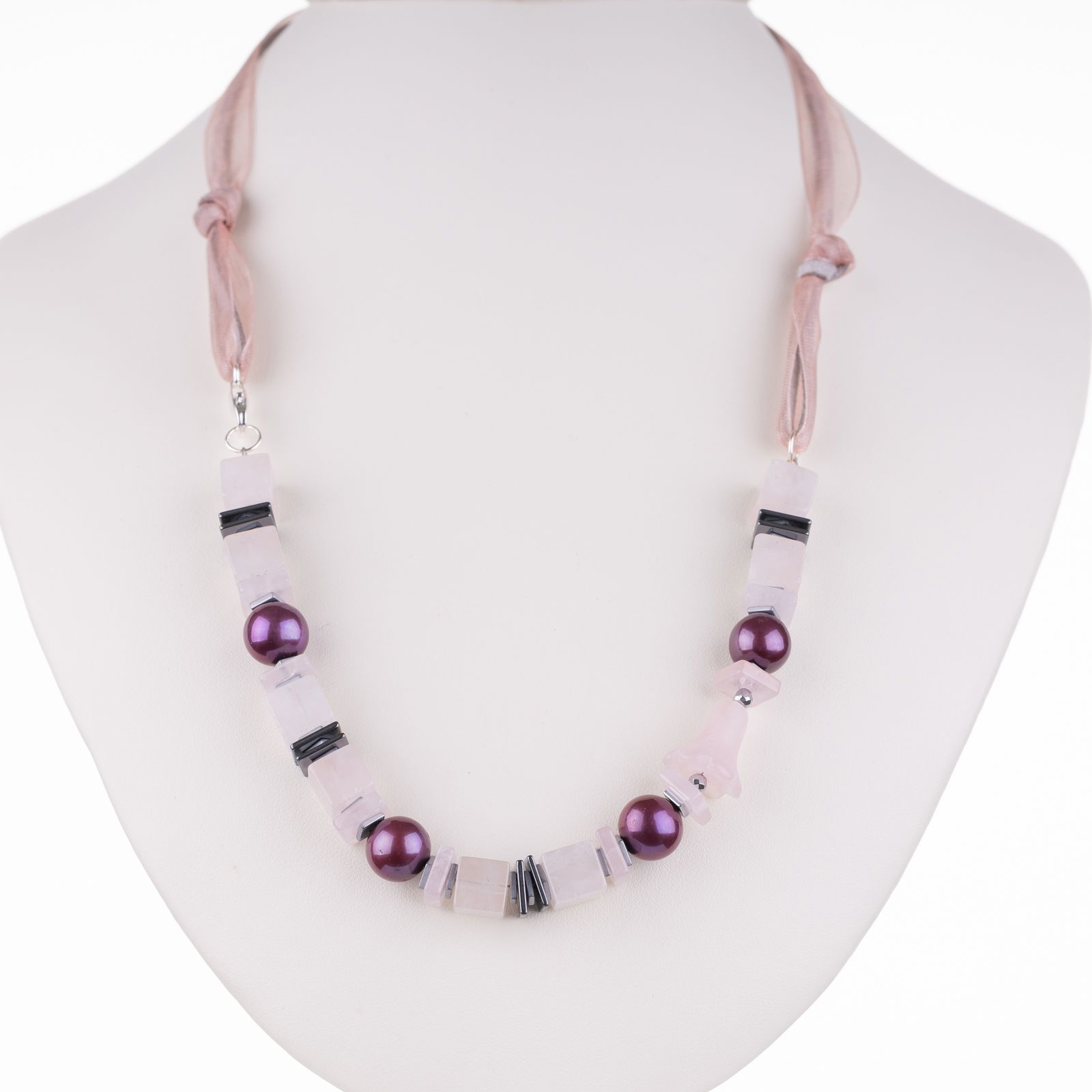 Colier handmade din cuburi de cuart roz, perle si placute de hematit.
