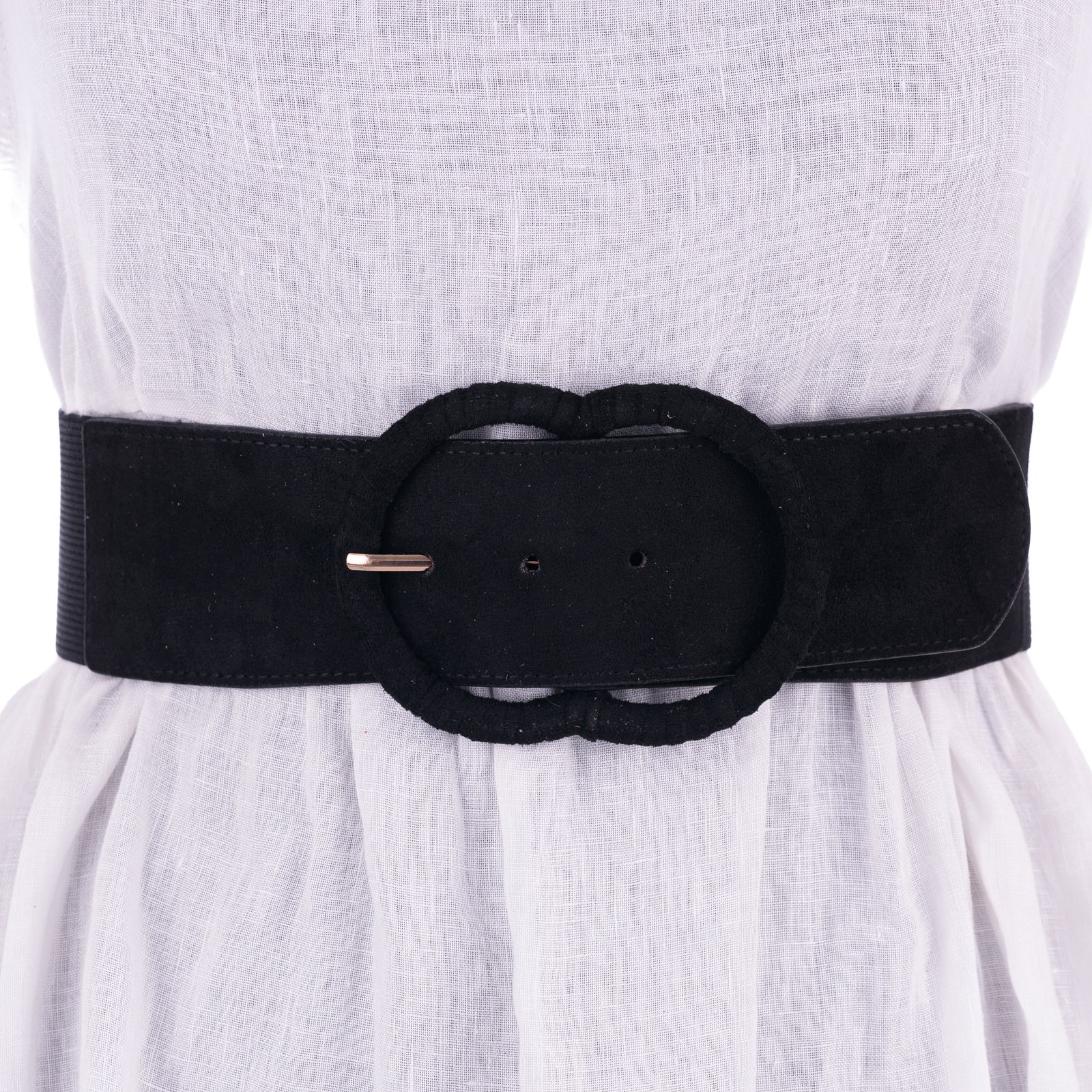 Curea din piele intoarsa ecologica cu catarama imbracata si elastic la spate, neagra