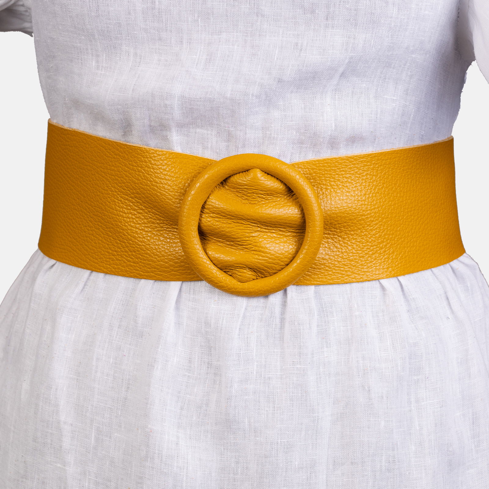 Curea galben mustar din piele naturala cu latime de 7 cm, catarama rotunda imbracata in piele