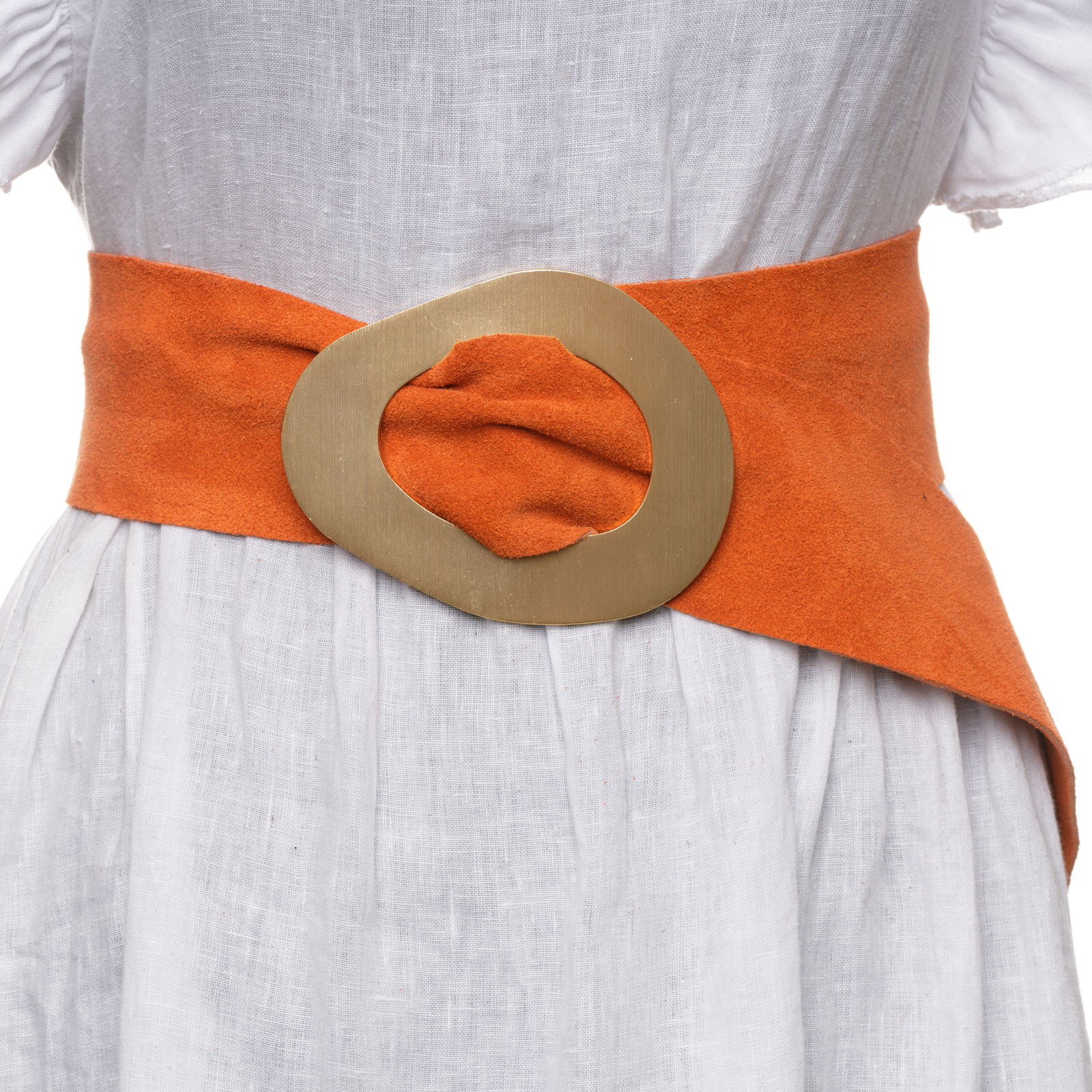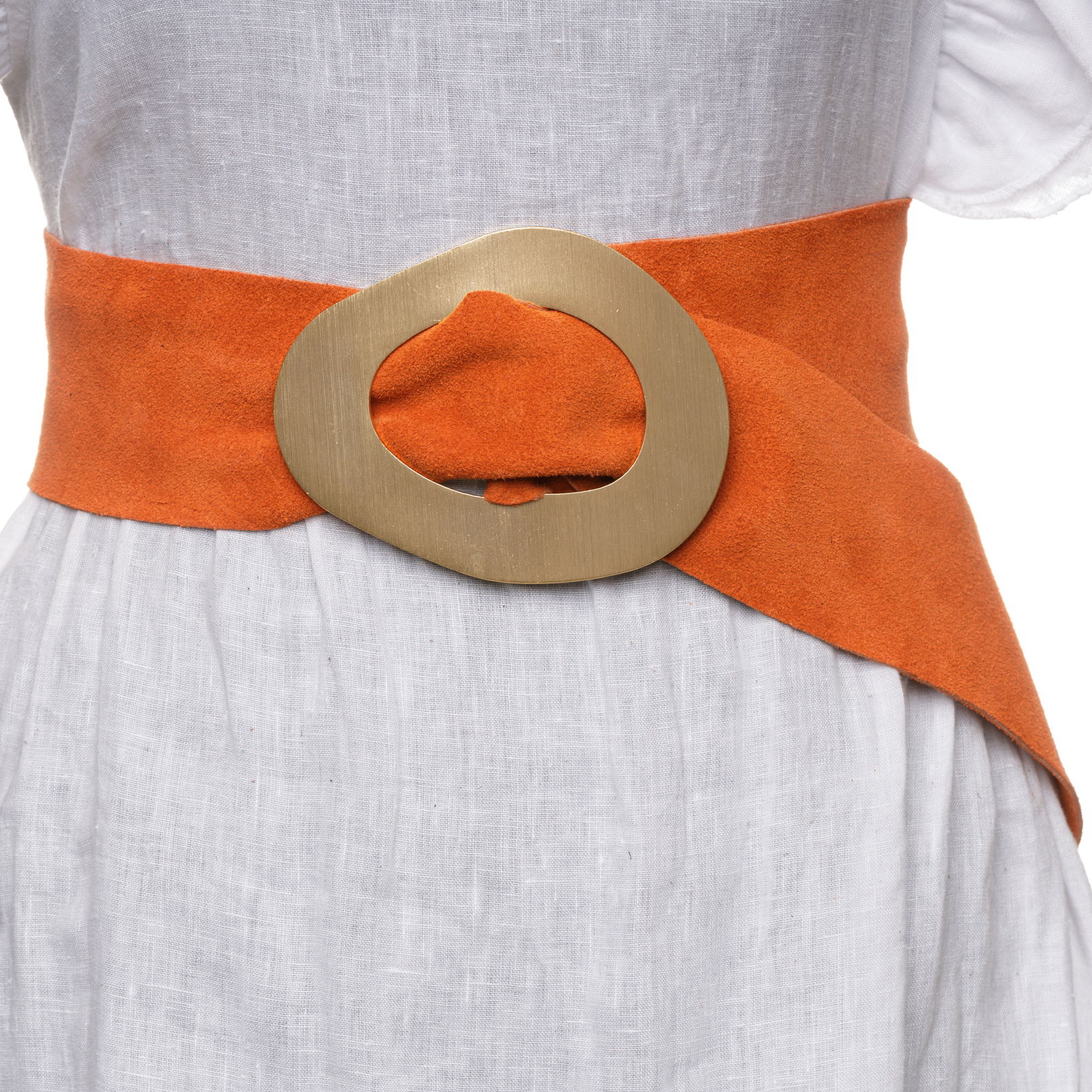 Curea portocalie din piele intoarsa naturala cu latime de 8 cm, catarama aurie neregulata