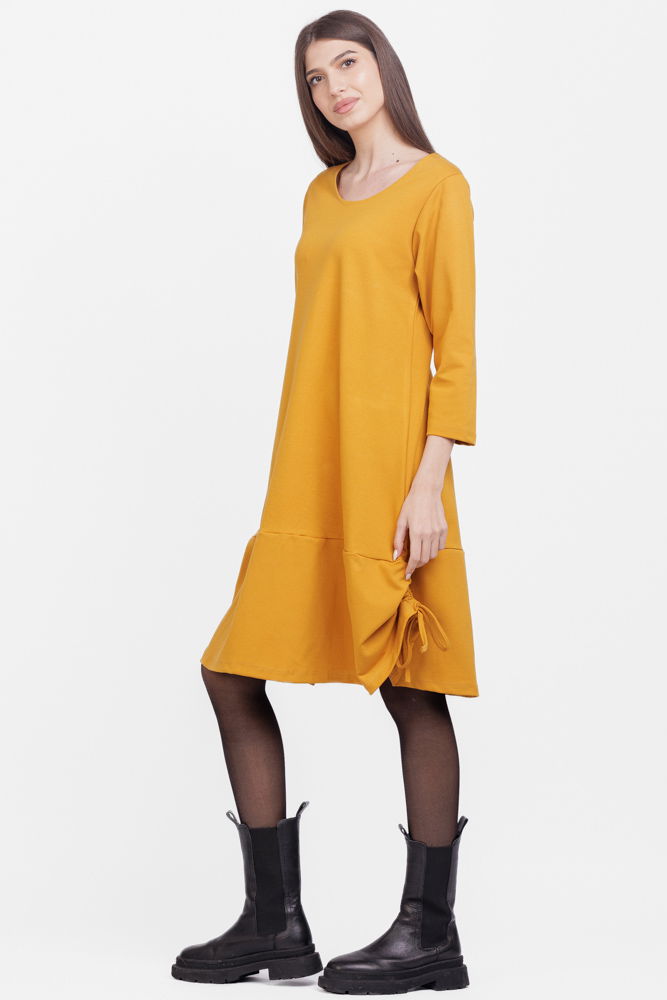 Rochie `A line`, din tricot, cu sireturi laterale, mustar