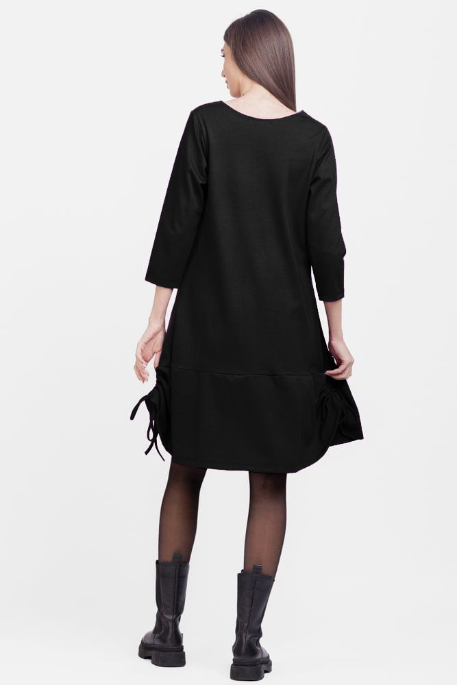 Rochie `A line`, din tricot, cu sireturi laterale, neagra cu imprimeu flori stilizate
