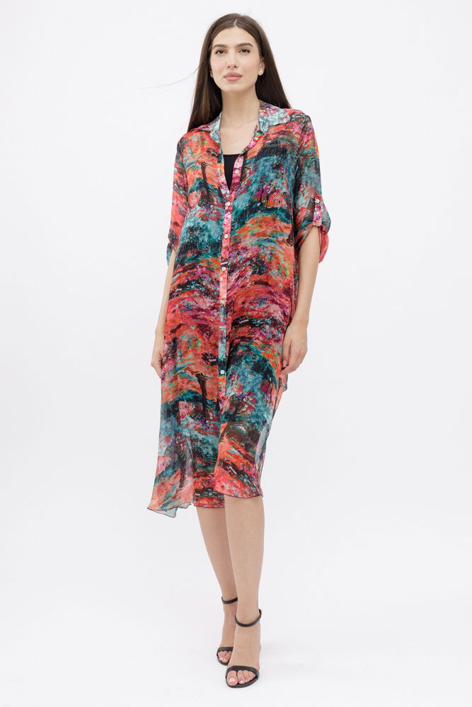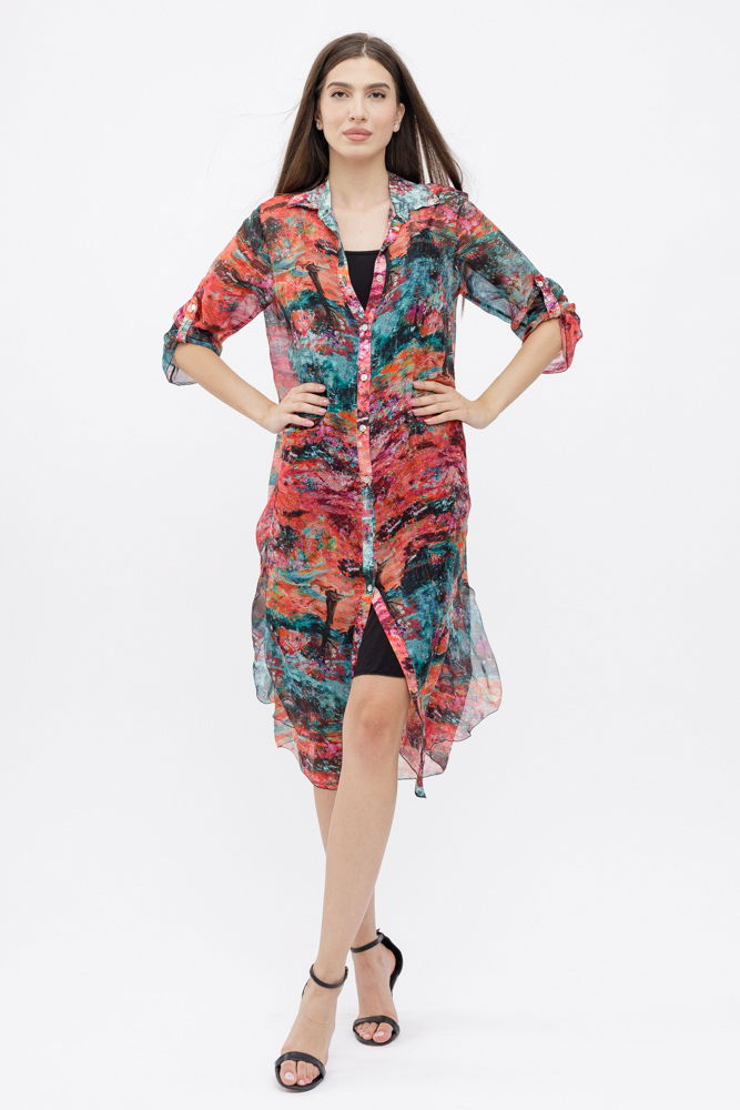 Shopika Rochie camasa A-line din matase si vascoza cu dublura , imprimeu pictural cu rosu si turcoaz