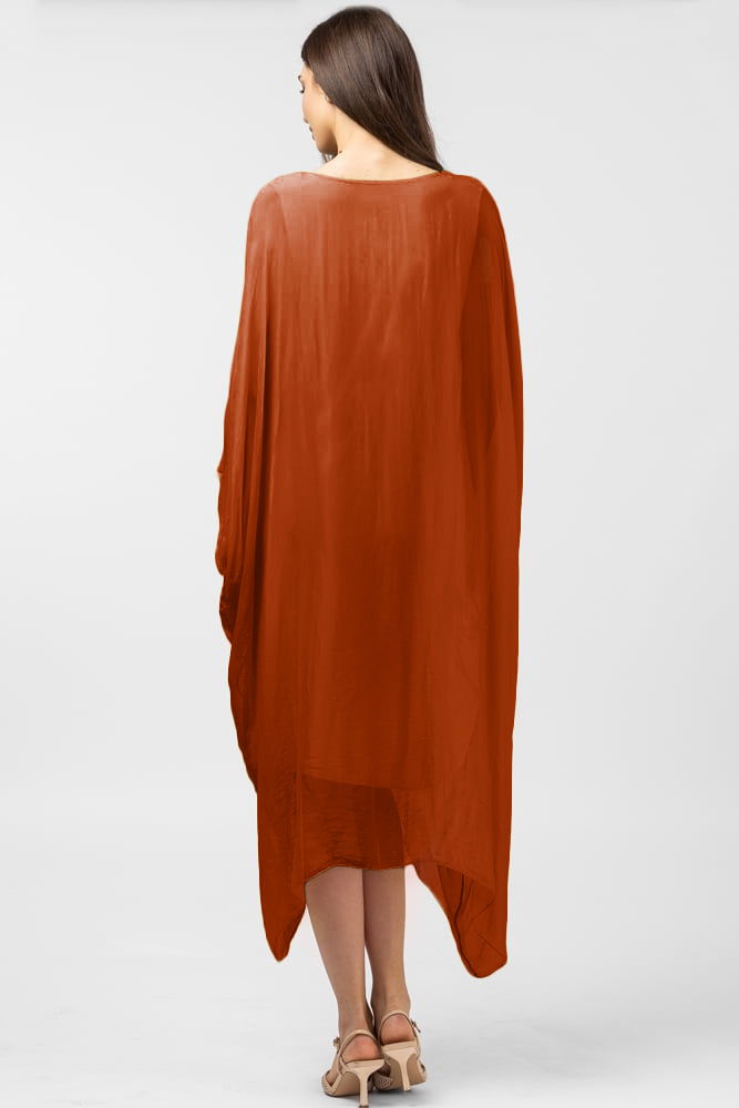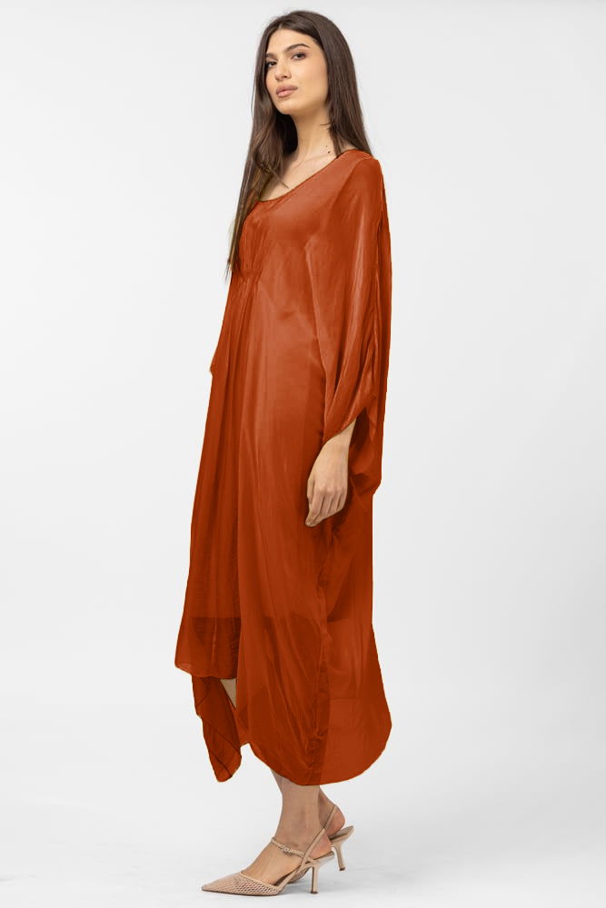 Shopika Rochie caramiziu intens in colturi, lunga, ampla, din matase si vascoza, cu detaliu sub bust