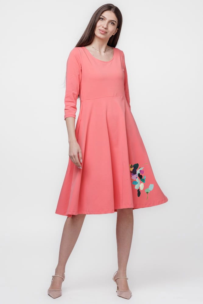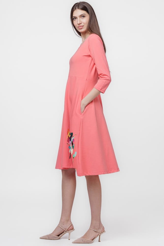Pierino Rochie clos, taiata in talie, cu buzunare ascunse, din bumbac, corai cu imprimeu floare stilizata
