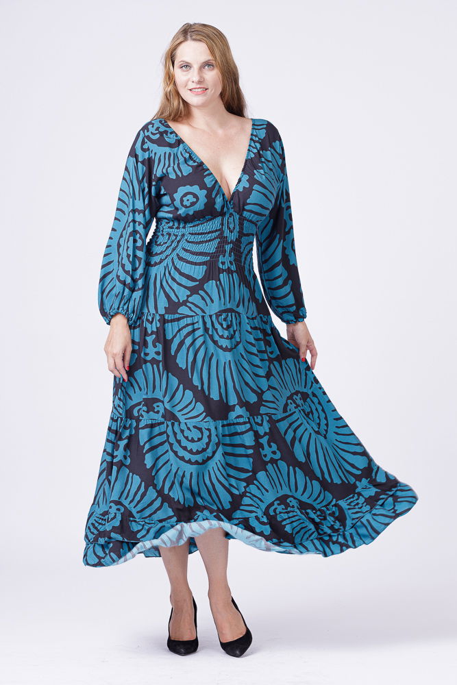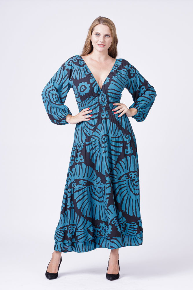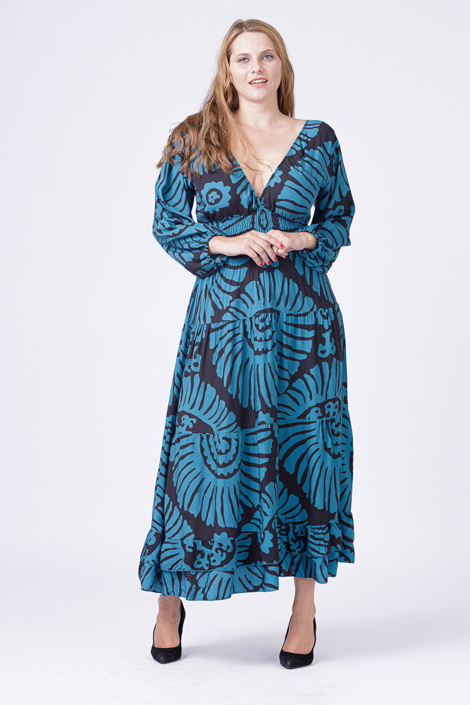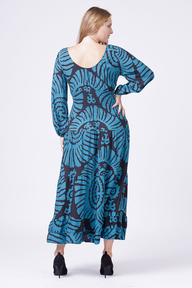 Shopika Rochie cu banda elastica in talie si volane, imprimeu turcoaz-negru