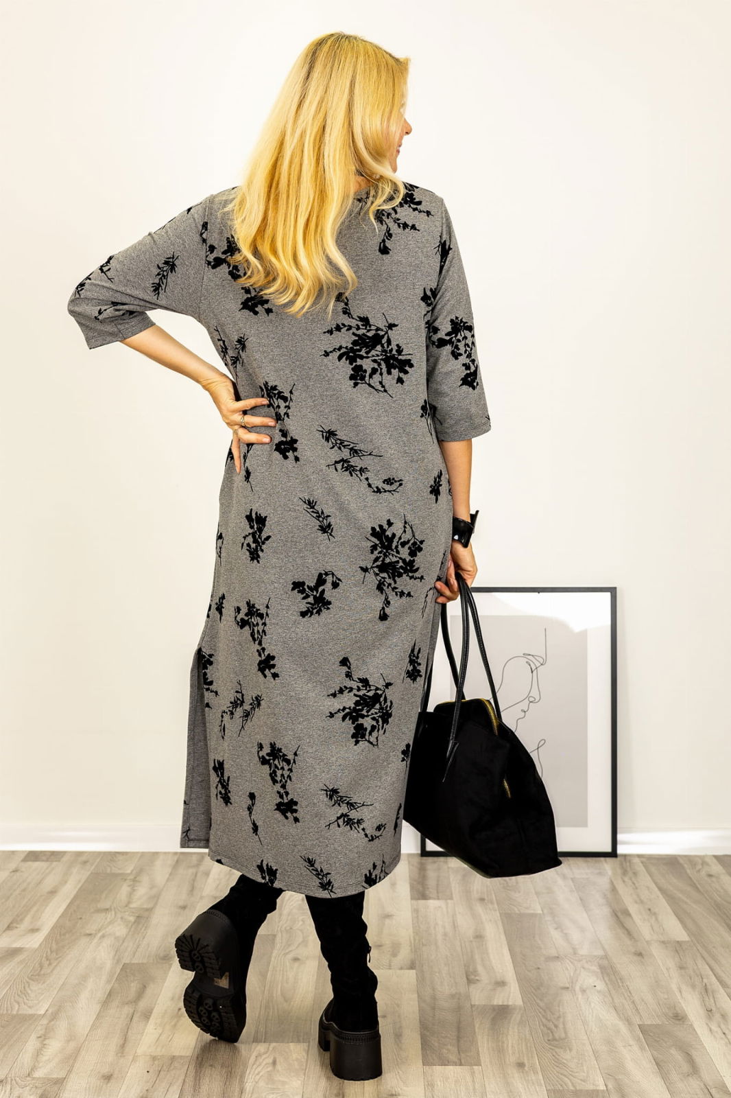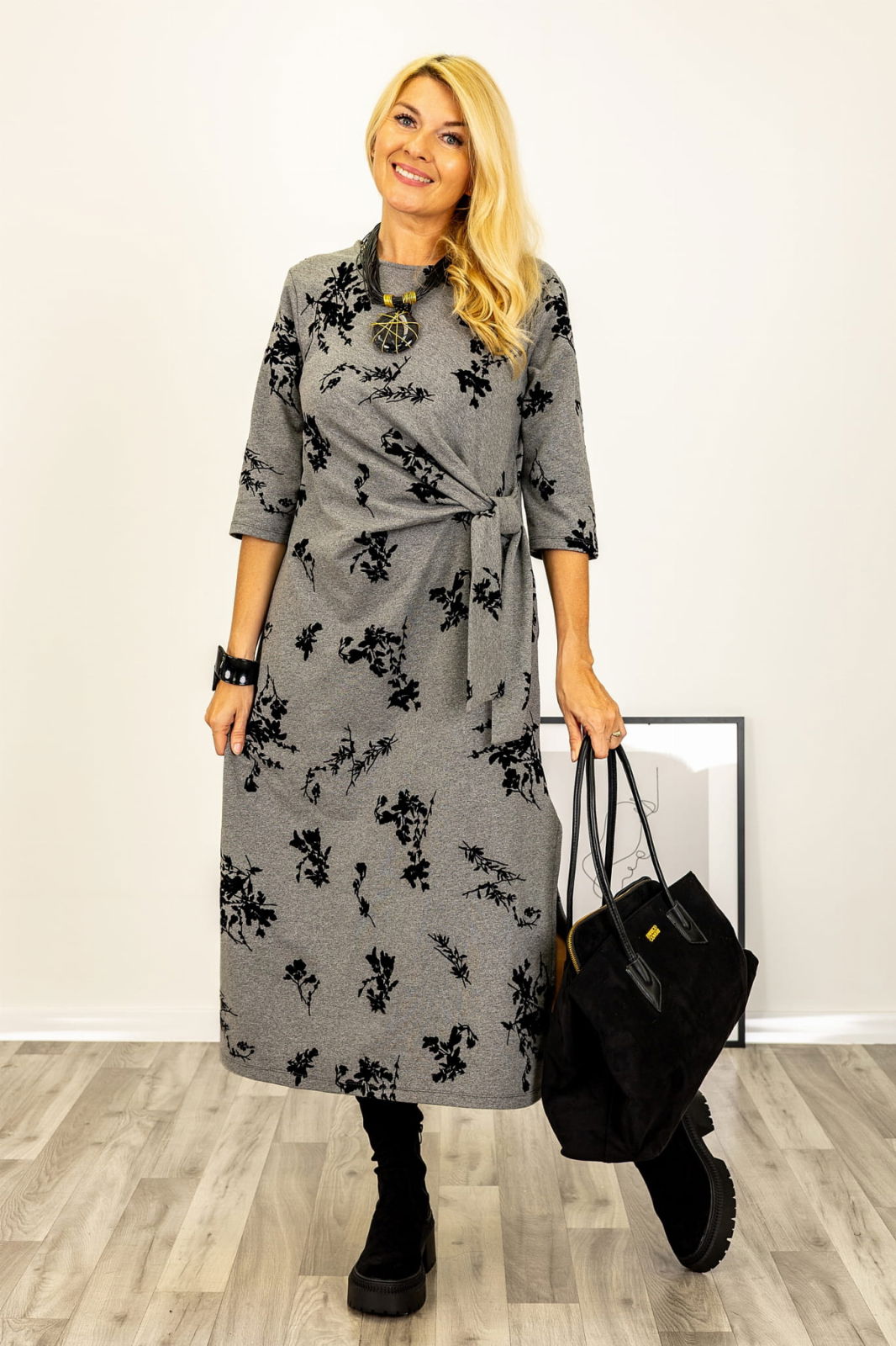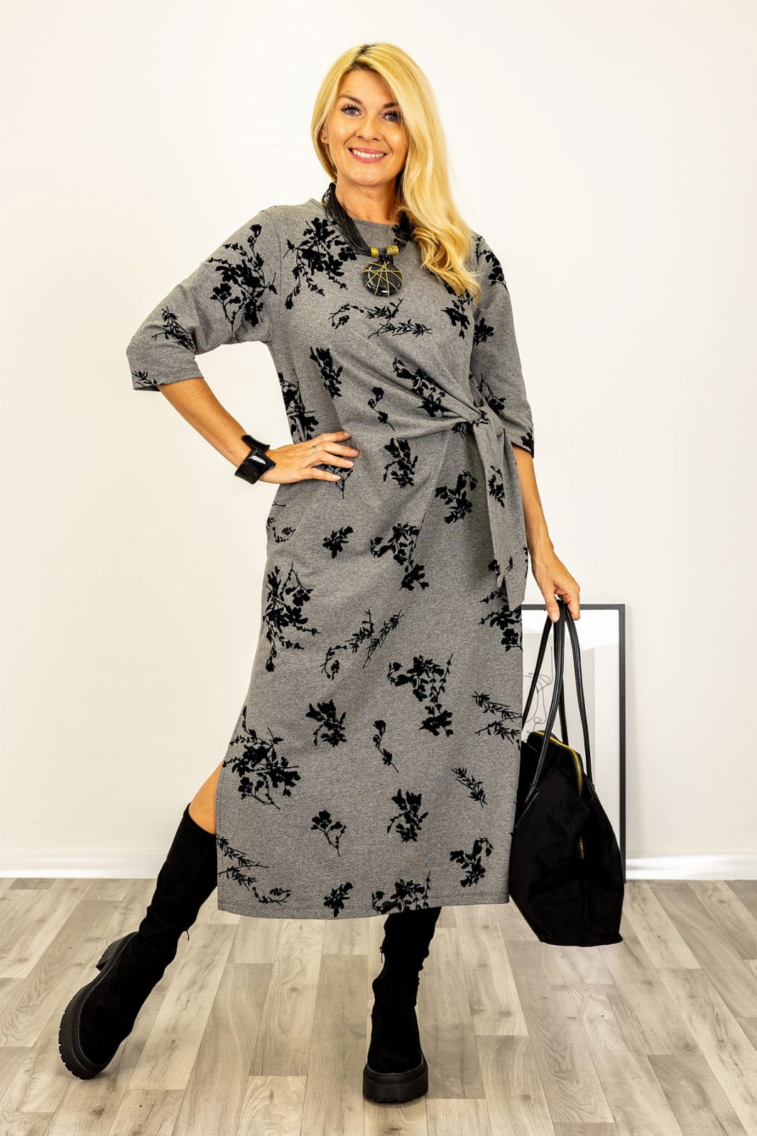 Rochie cu nod intr-o parte imprimata cu flori embosate si catifelate, din jerseu de bumbac gri