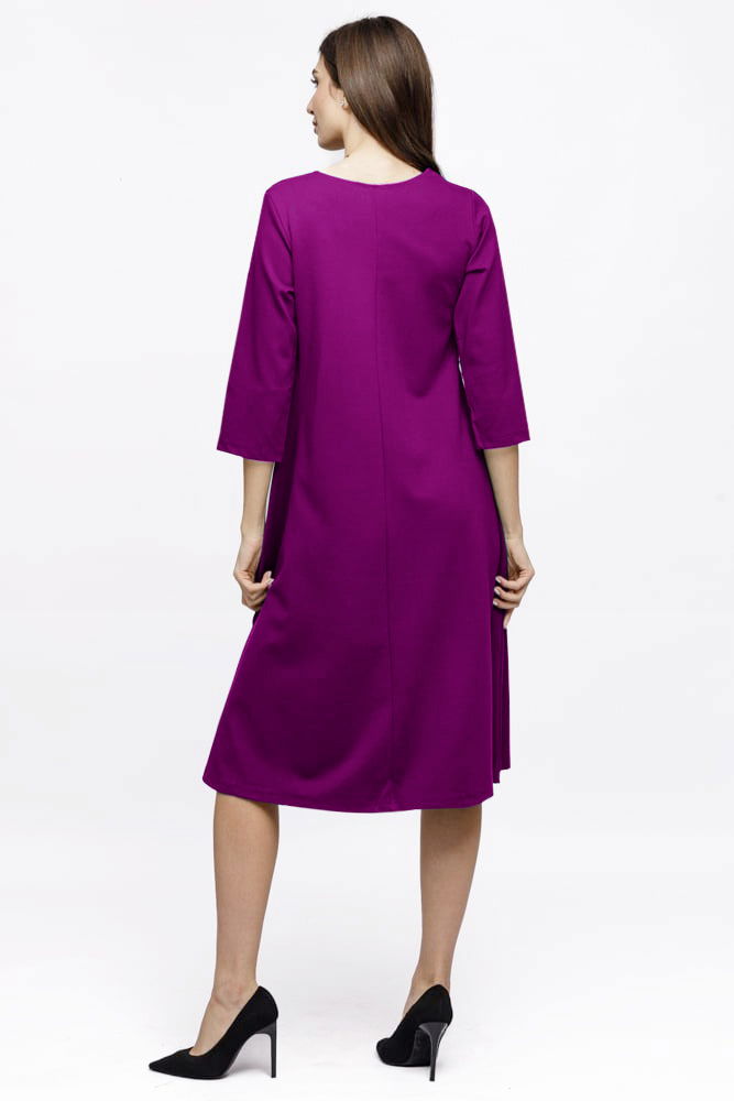 Rochie Eva midi mov zmeura A line din tricot de vascoza si decolteu rotund, imprimeu floare la piept