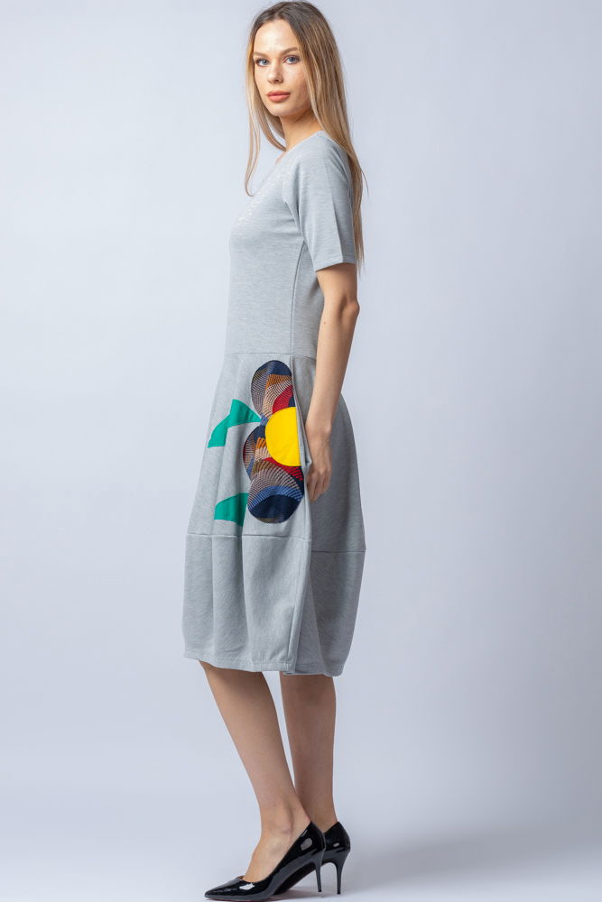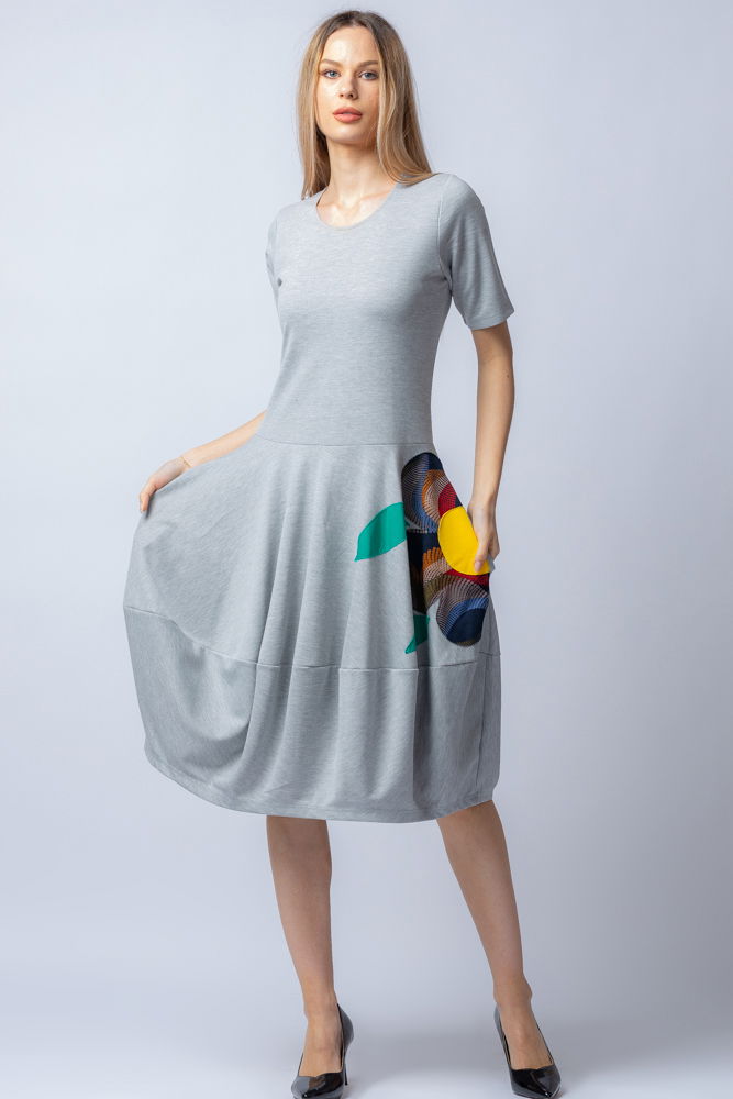 Pierino Rochie gri midi de tip lalea, cu aplicatie cusuta in forma de floare