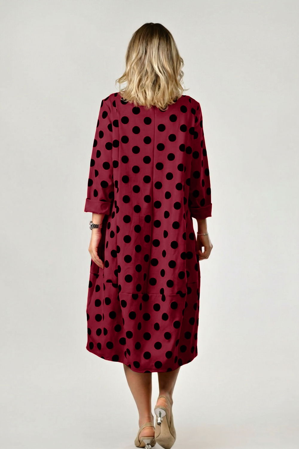 Este genul de piesa pe care o porti cu usurinta in zilele aglomerate, dar si atunci cand vrei un look relaxat si chic, fara efort. Textura placuta si contrastul grafic al bulinelor transforma rochia intr-o aparitie moderna si versatila.