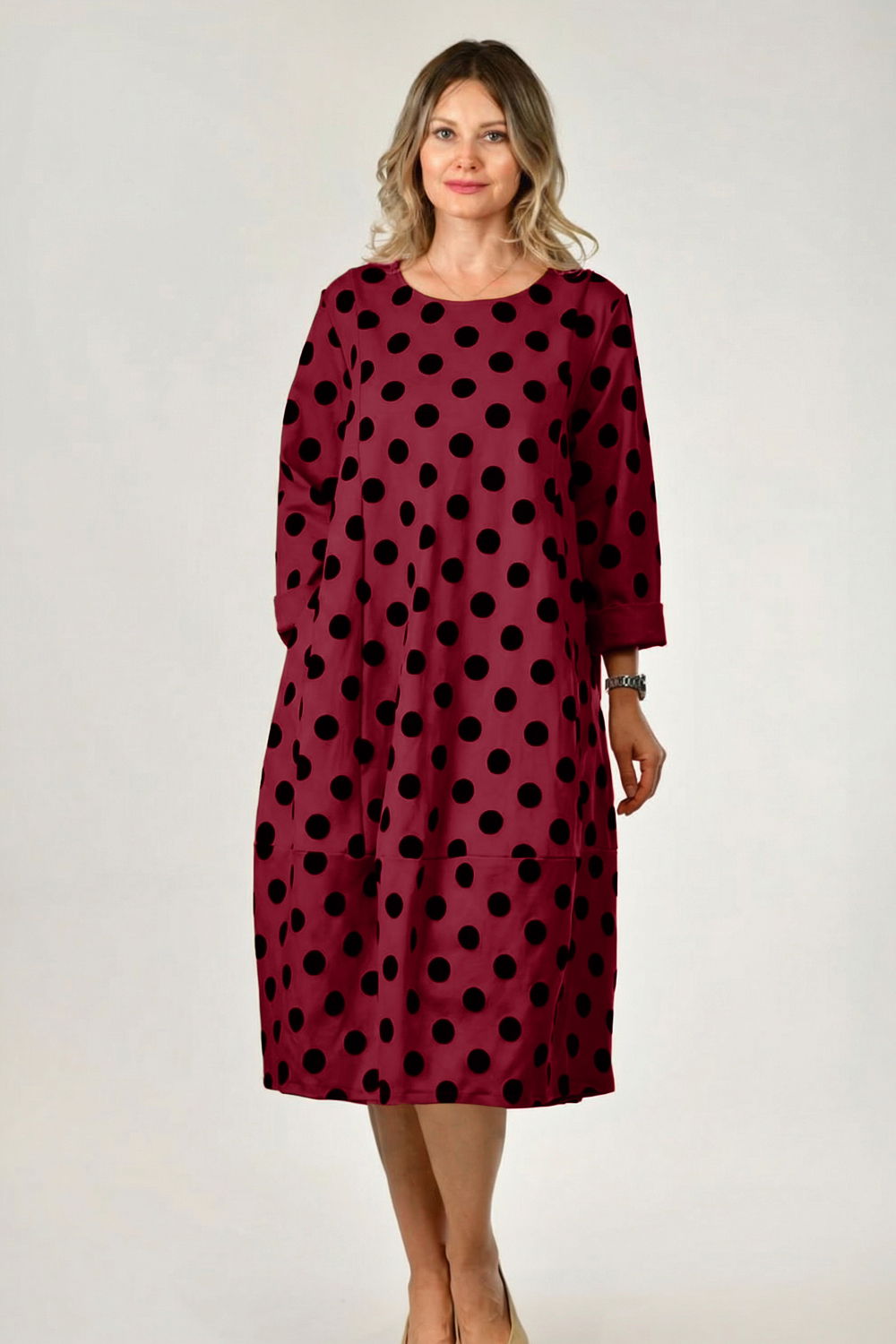 Rochie lalea, bordo cu buline embosate, catifelate si croi lejer, din vascoza