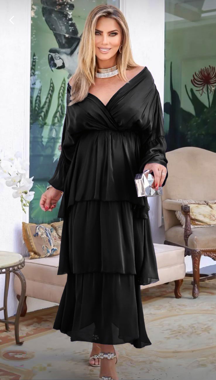 Shopika Rochie lunga suprapusa din matase, cu trei volane mari si maneca lunga, neagra