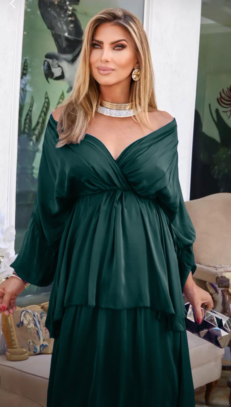 Shopika Rochie lunga suprapusa din matase, cu trei volane mari si maneca lunga, verde inchis