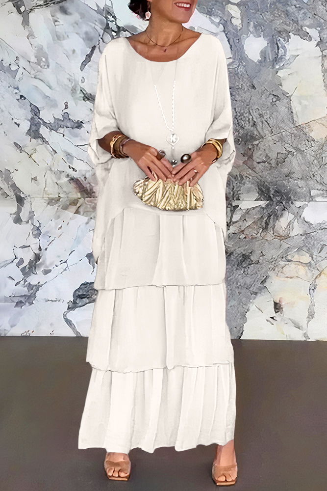 Shopika Rochie lunga suprapusa din matase si vascoza, cu trei volane mari si maneca cazuta, alba