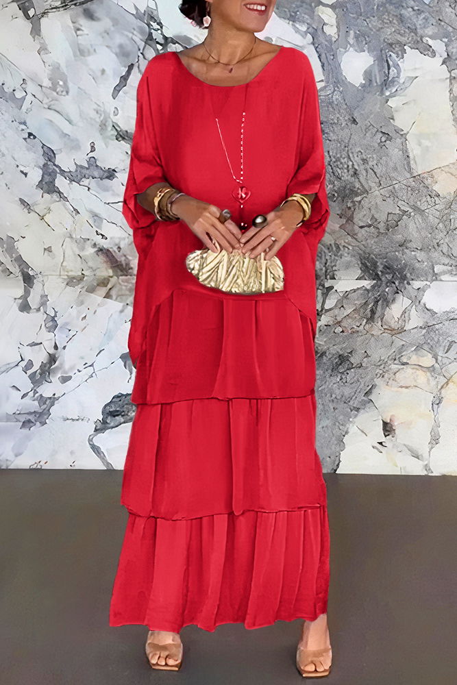 Shopika Rochie lunga suprapusa din matase si vascoza, cu trei volane mari si maneca cazuta, fucsia