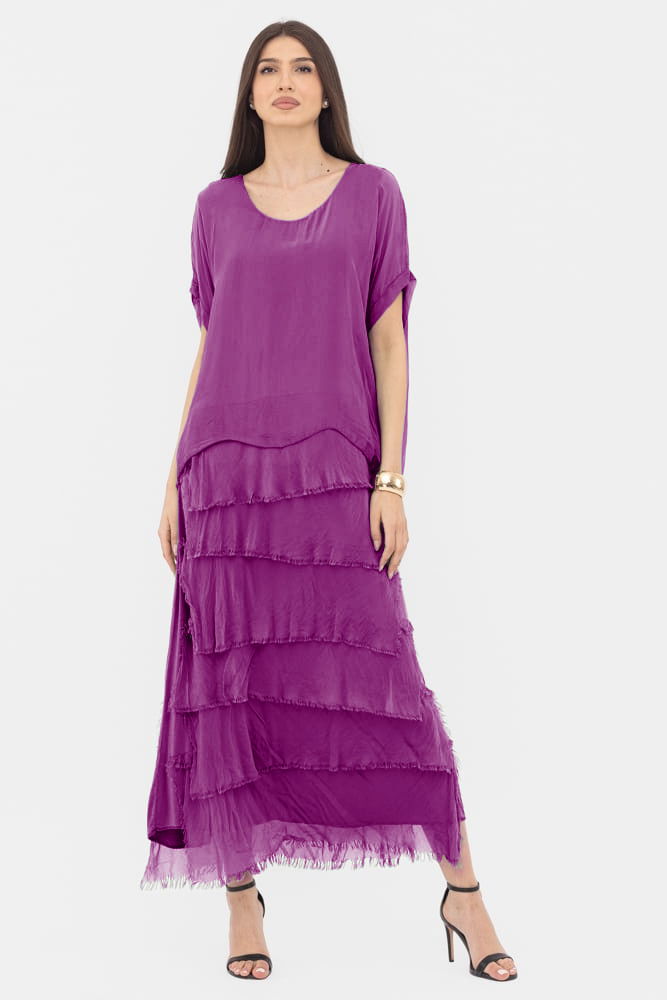 Shopika Rochie magenta din matase si vascoza cu volane franjurate suprapuse