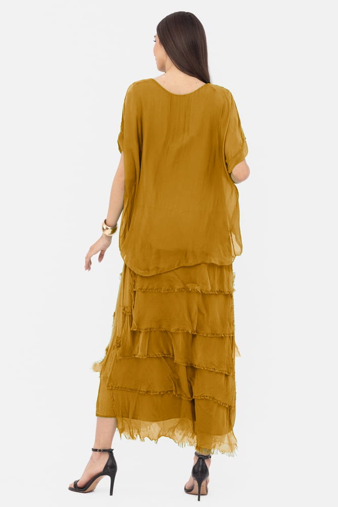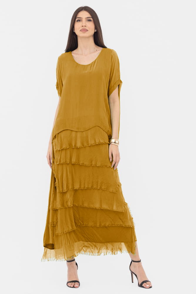 Shopika Rochie mustar din matase si vascoza cu volane franjurate suprapuse