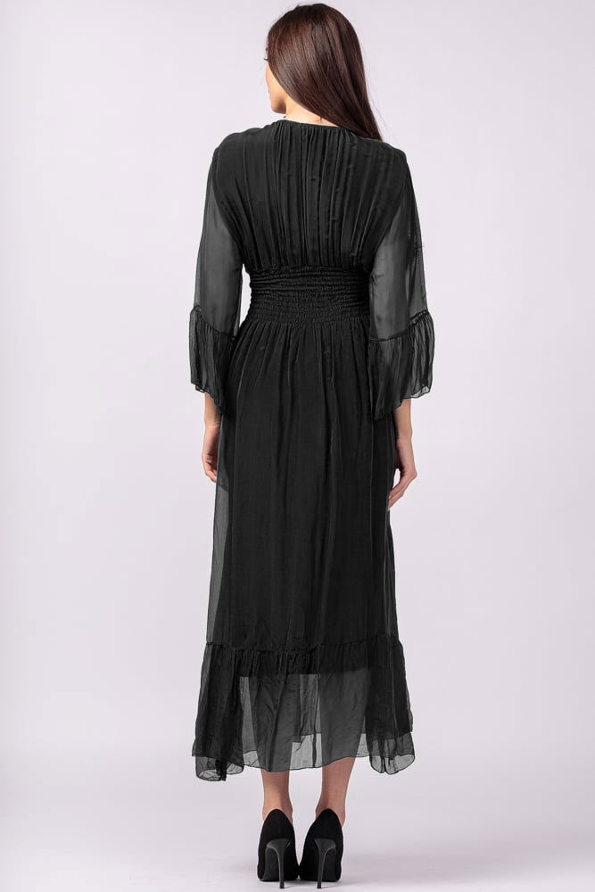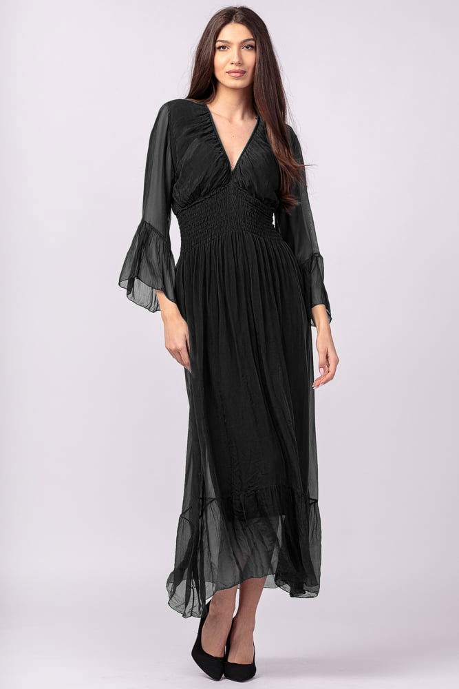 Shopika Rochie neagra din matase si vascoza cu banda elastica in talie si volane