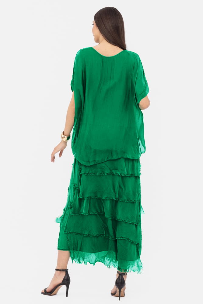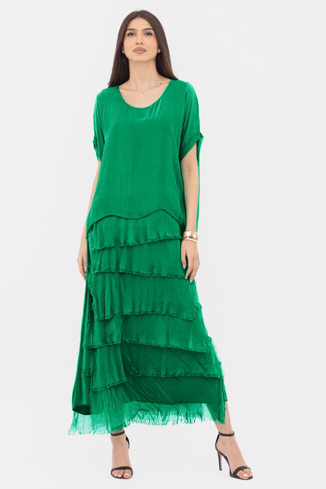 Shopika Rochie verde smarald din matase si vascoza cu volane franjurate suprapuse
