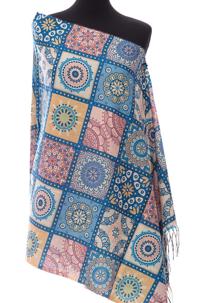 Shopika Esarfa casmir dreptunghiulara cu patrate modele marocane in nuante albastru-ocru