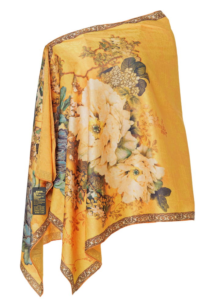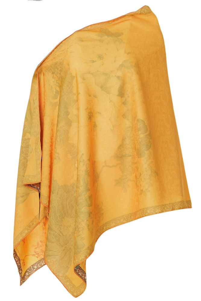 Esarfa dreptunghiulara cu doua fete, din matase, cu imprimeu floral pastelat in nuante de mov si galben auriu